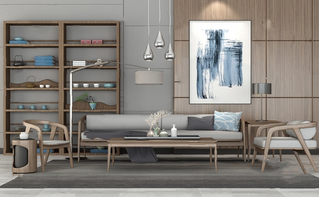 新中式沙发茶几置物架和装饰画组合素材之家精选3D模型