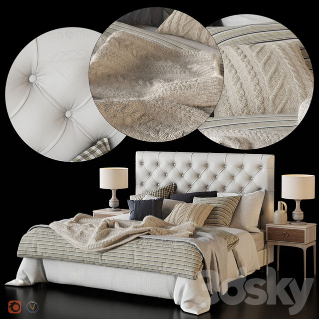 欧式双人床亚麻布床垫枕头床头柜和台灯组合素材之家精选3D模型