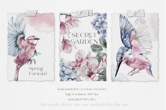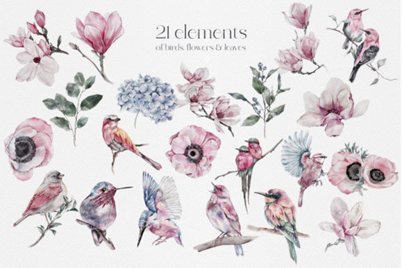 这是21种手绘水彩花朵,叶子和异想天开的鸟的集合,这些花朵以精致的粉红色,蓝色和绿色色调呈现。
