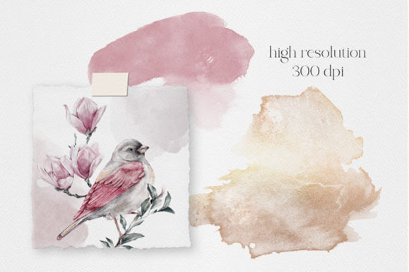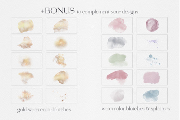 最后,奖金! Spring Melody系列调色板中的10个高分辨率水彩金色斑点以及10个水彩斑点和飞溅的集合–创造无限的可能性!