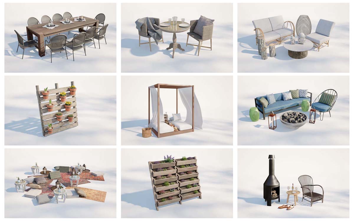 包括28个专业的,高度详细的3d模型,用于建筑可视化。该系列配有高质量的户外家具。所有对象都可以在可视化中使用。