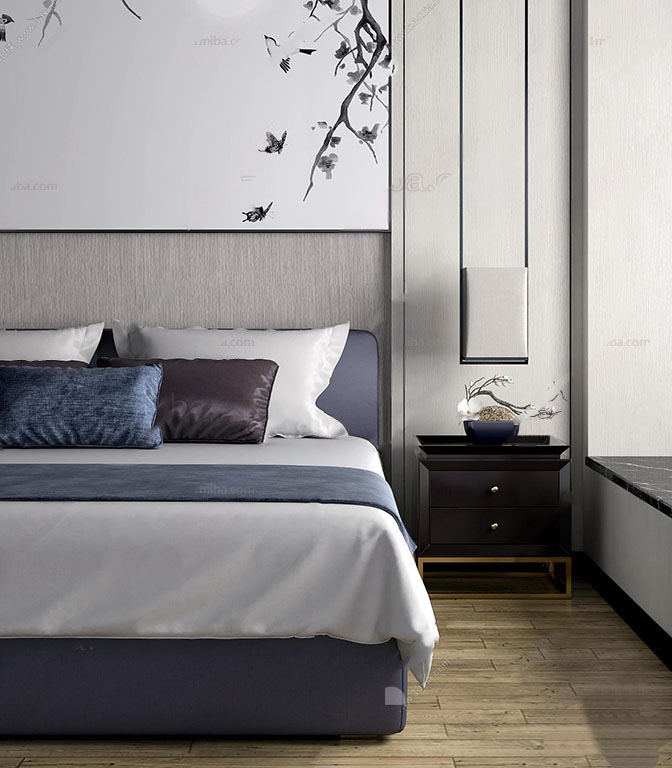 新中式布艺双人床床头柜吊灯组合素材之家精选3D模型