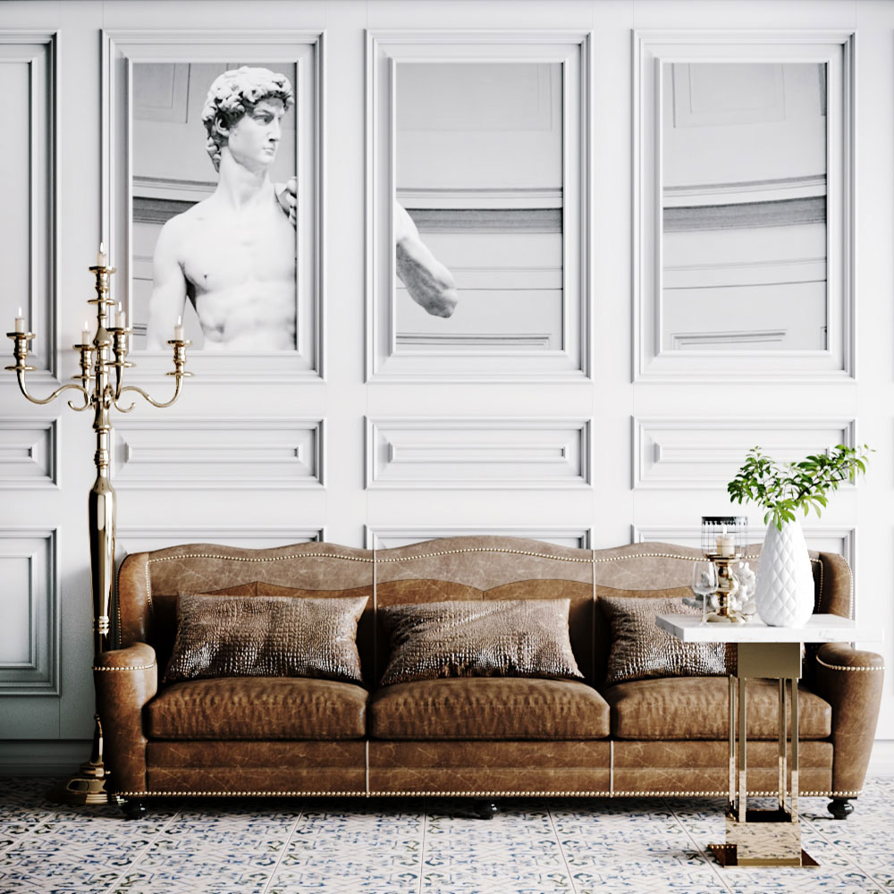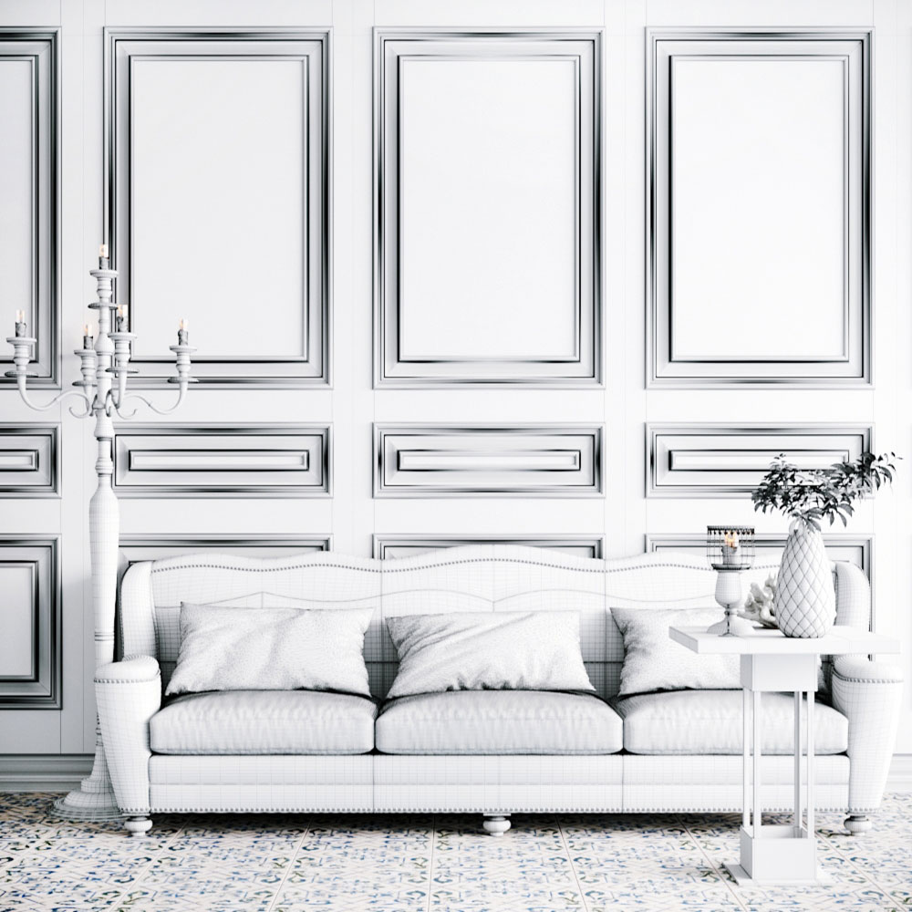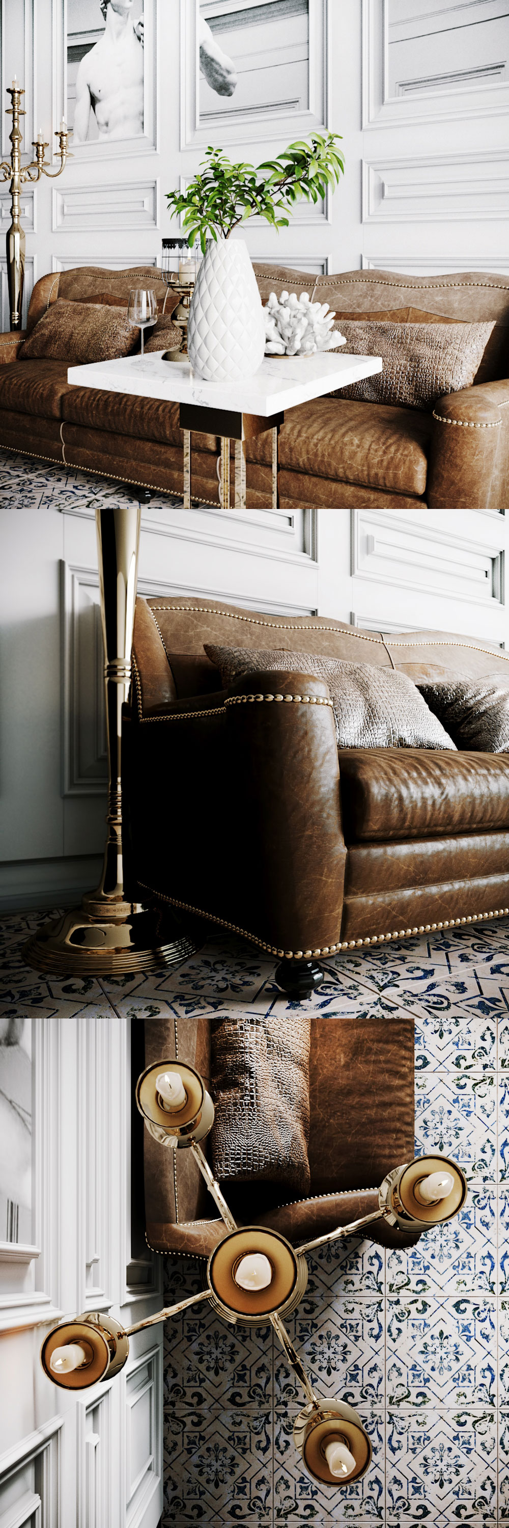 在场景中有:沙发1933-03沙发HIGH COUNTRY H43 W104 D26 in。雕刻木板地板砖Cicogres-Lotto-Azul带装饰的桌子蜡烛带有不同的烛台预览中出现的所有装饰都带有纹理