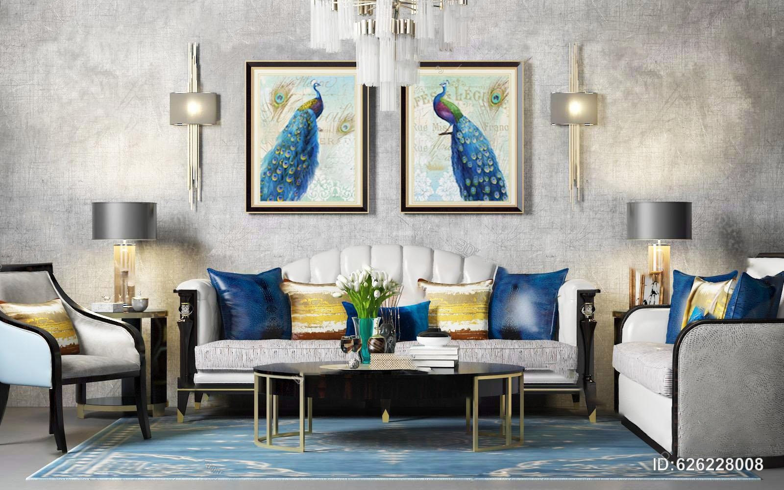 简欧沙发圆形茶几灯具挂画组合素材之家精选3D模型