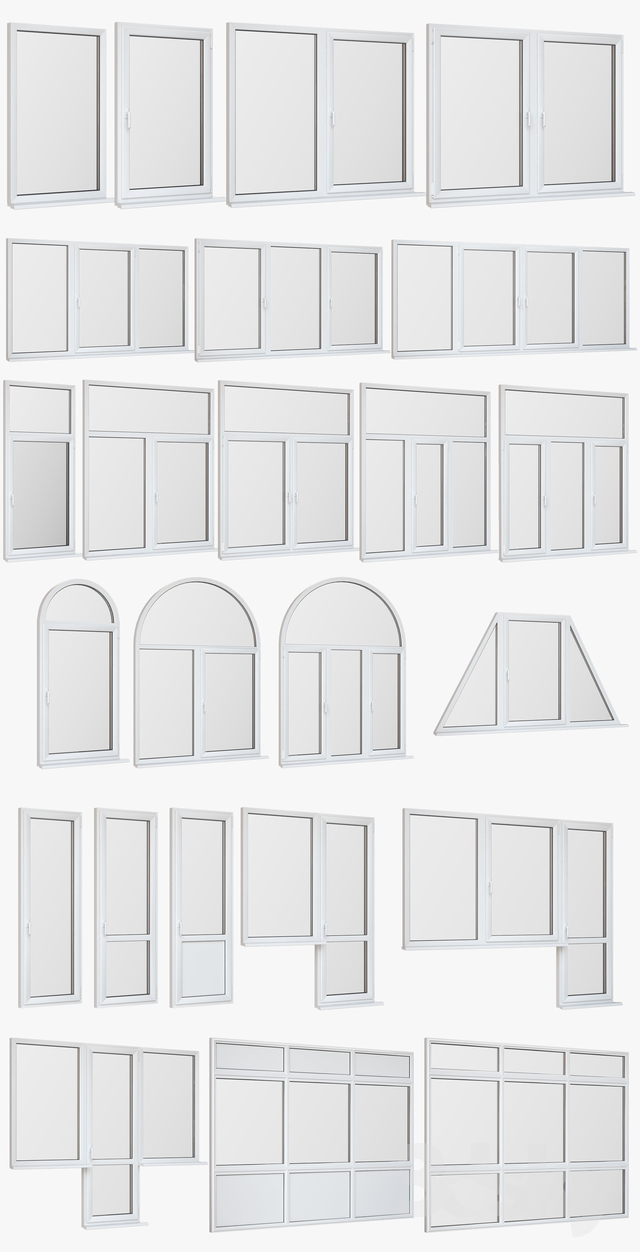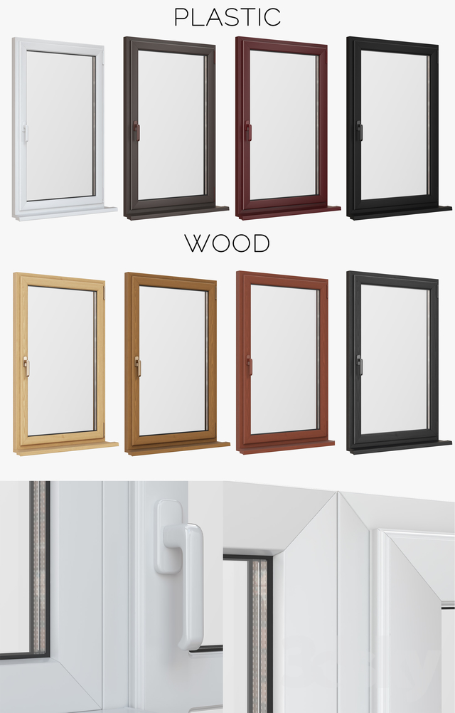 A set of plastic windows and doors of 8 colors, 24 versions of windows and doors. The drilldown model is suitable for close-ups and 4K renderers.