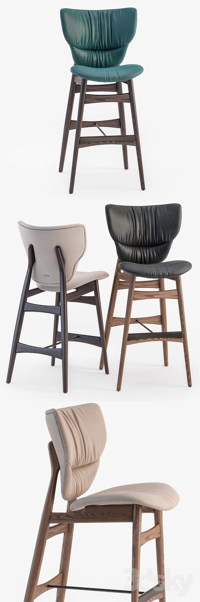 Stool with frame in Canaletto walnut stained ashwood, burned oak stained ashwood or open pore matt white or black painted ashwood. Seat and back upholstered in fabric, synthetic nubuck, synthetic leather or soft leather as per sample card.