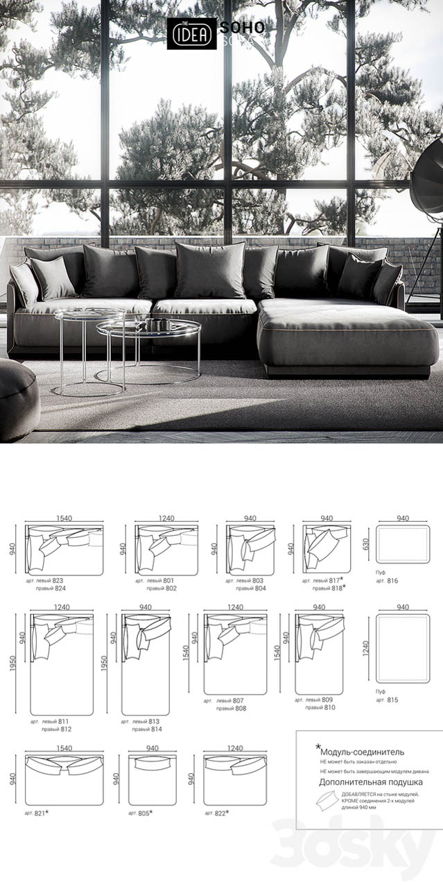 在SOHO组合式沙发中,柔软的羽绒枕头被和谐地组合在一起,舒适而深沉的底垫,坚实的底座和坚实的桦木框架。该系列的亮点是装饰性边缘,其颜色可与IDEA调色板中的沙发主面料相提并论。框架的侧线和装饰垫的平滑弯曲使本来就很舒适的沙发形象得到了鉴赏家的赞赏。