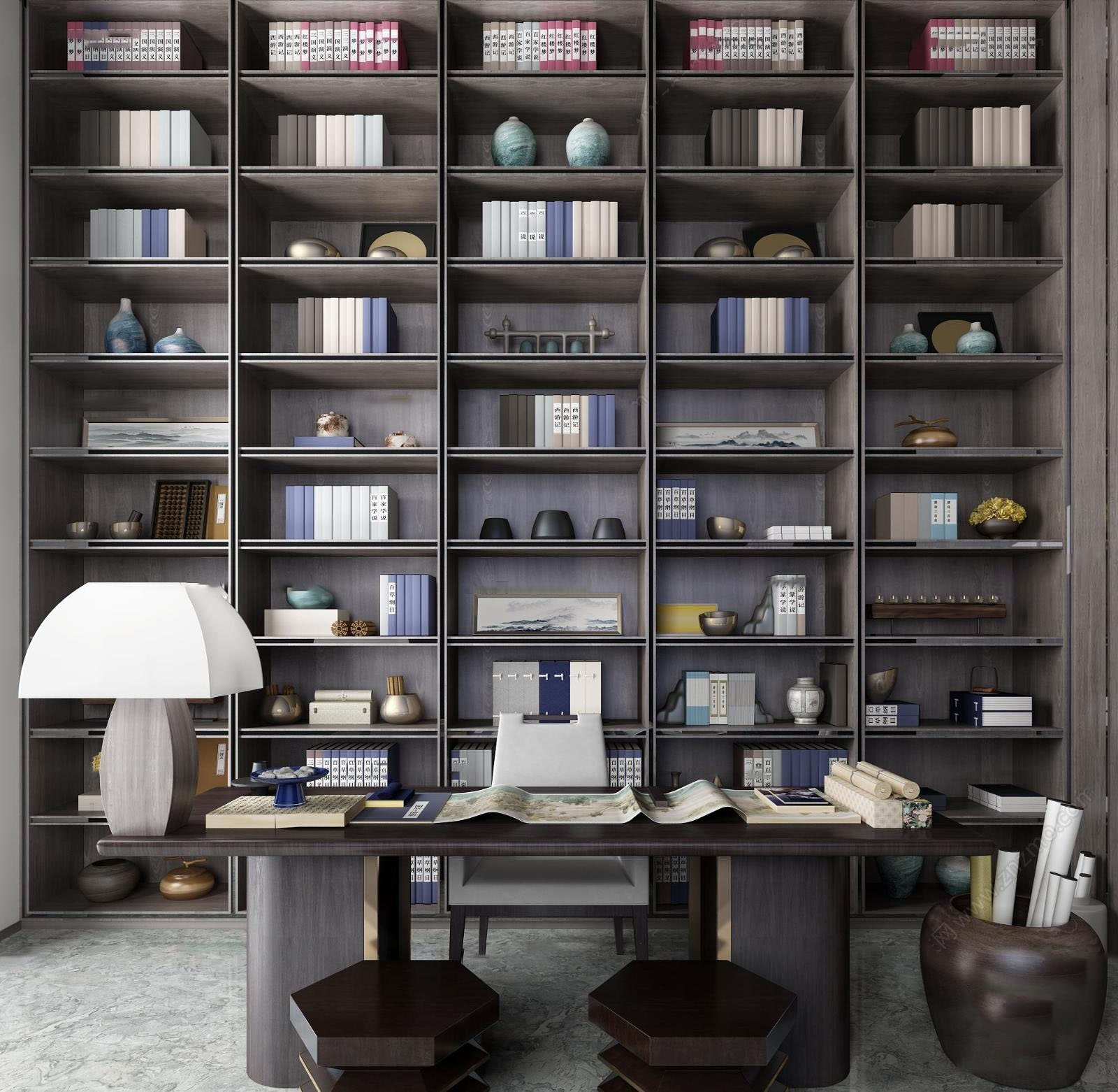 胡桃色实木书橱书桌椅组合素材之家精选3D模型