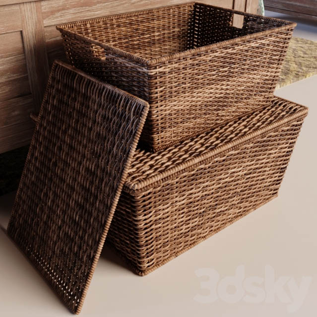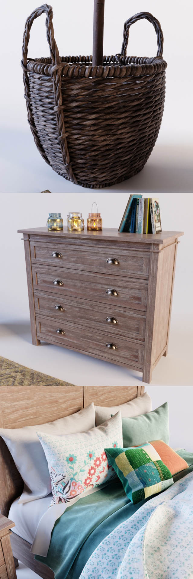 实木双人床和床头柜编织收纳篮装饰品素材之家精选3D模型
