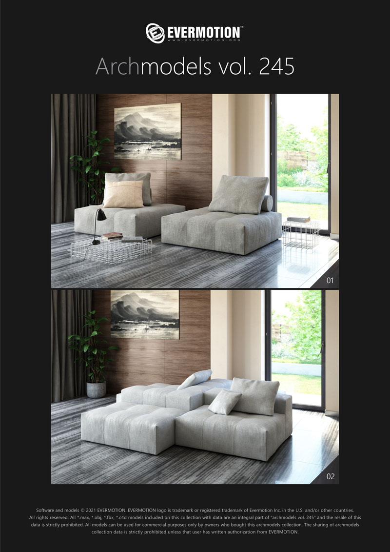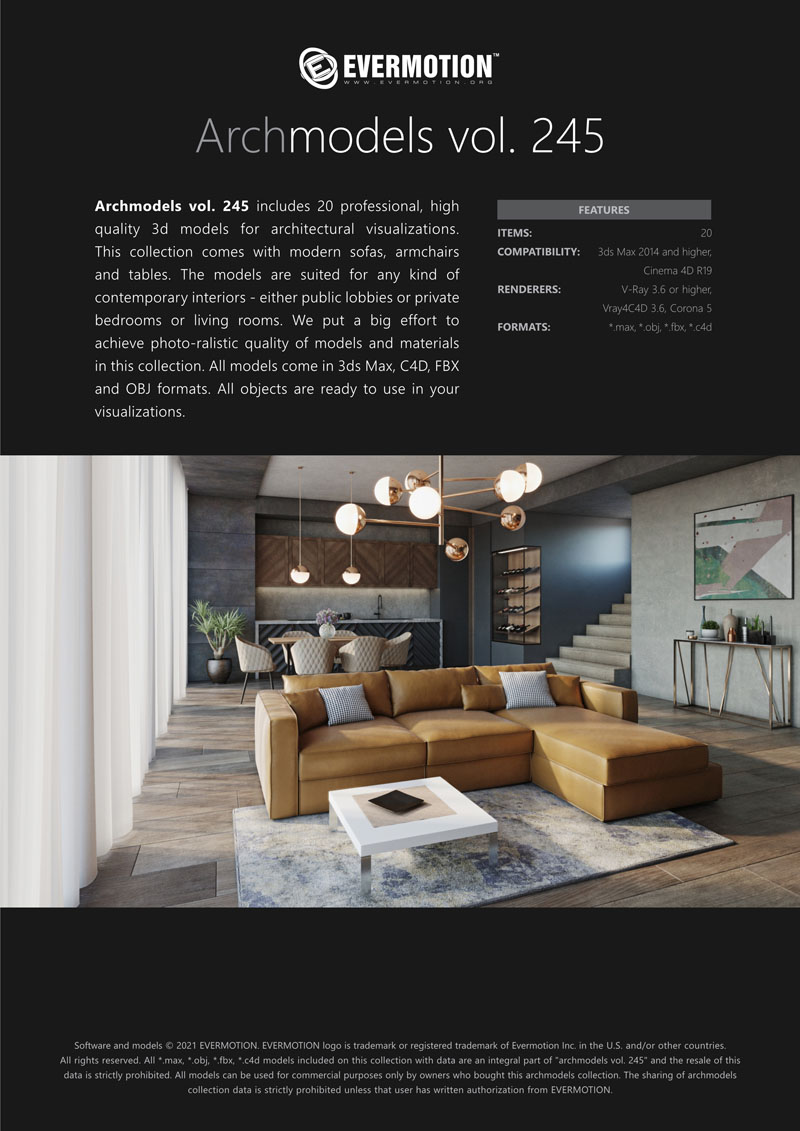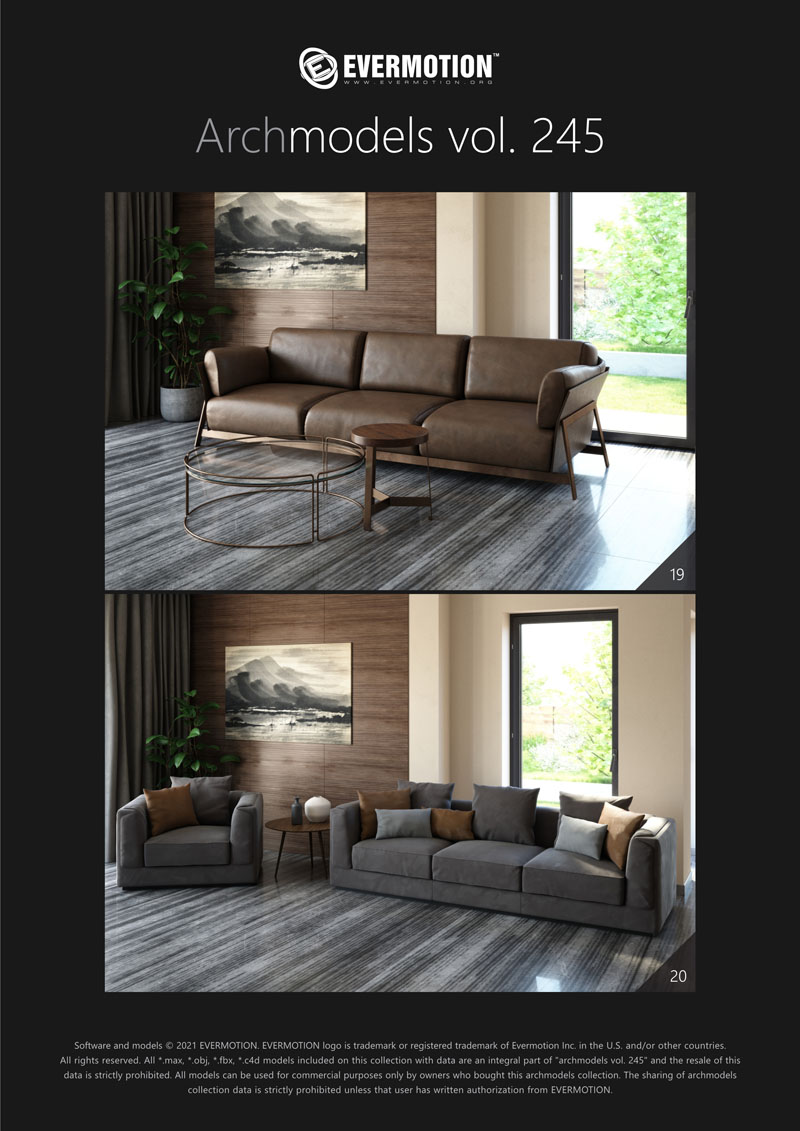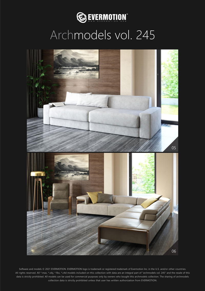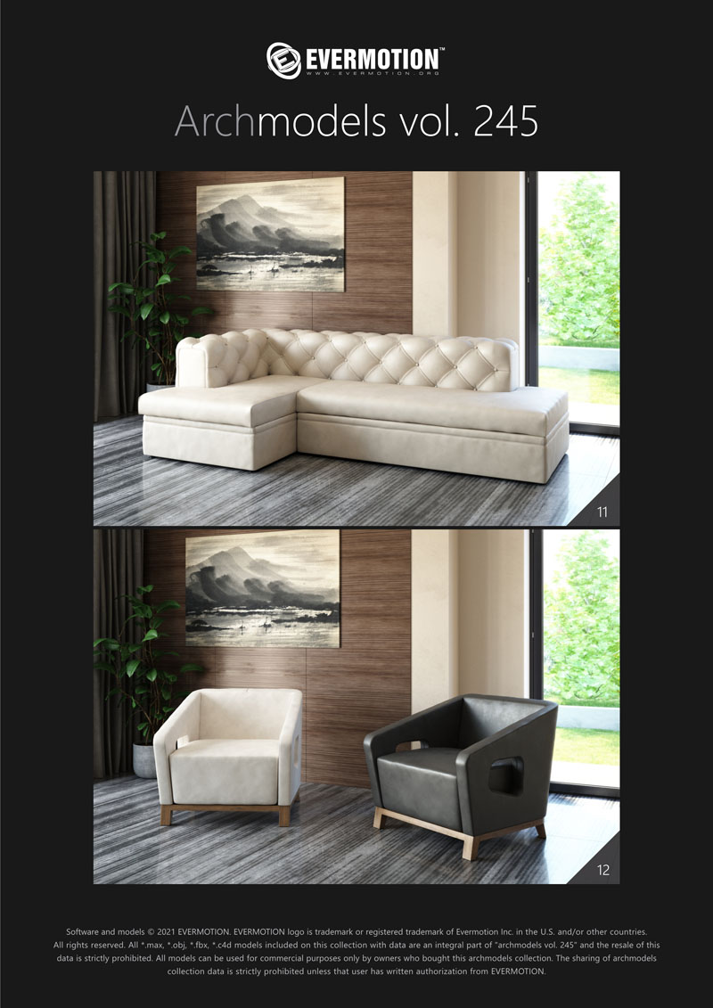 建筑模型卷 245包括用于建筑可视化的20个专业,高质量3d模型。 该系列配有现代沙发,扶手椅和桌子。 这些模型适用于任何类型的现代室内装饰-公共大厅,私人卧室或客厅。 我们为此付出了巨大的努力,以实现模型和材料的照片逼真的质量。 所有对象都可以在可视化中使用。