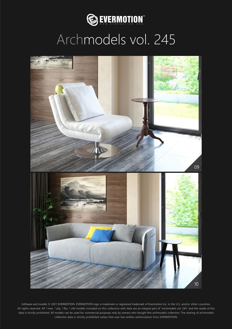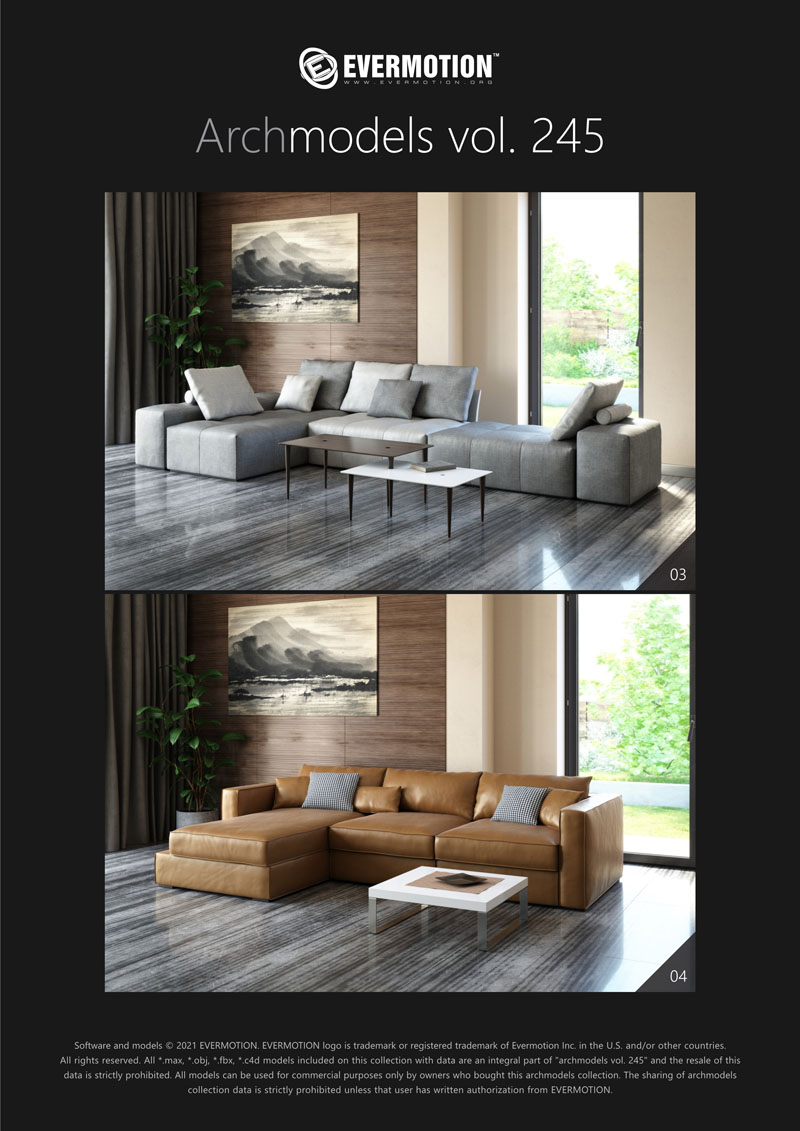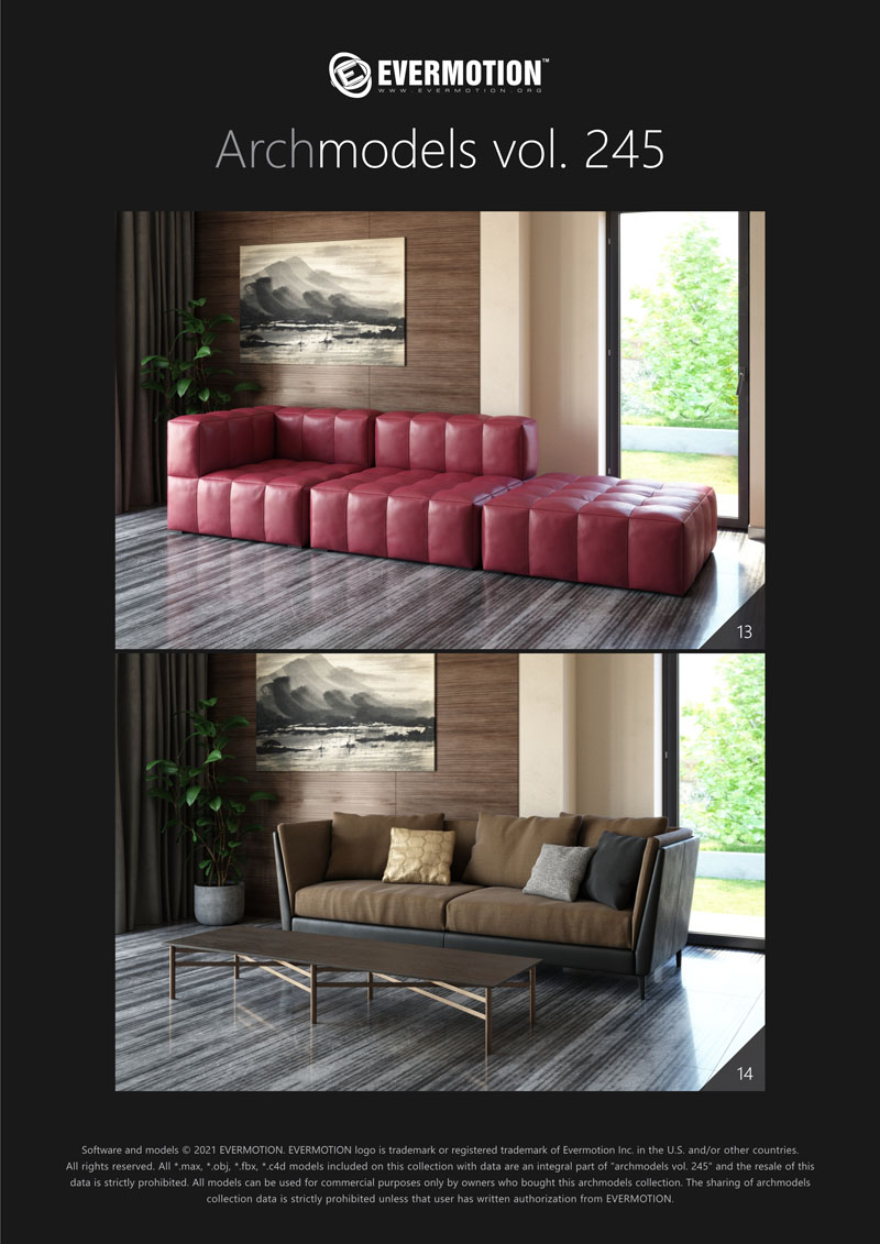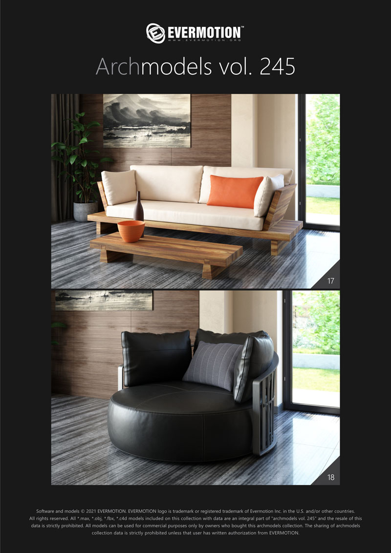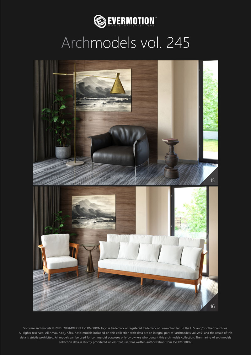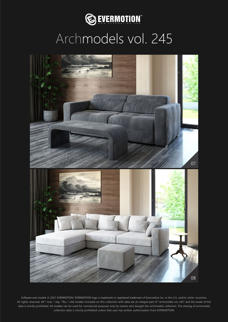 建筑模型卷 245包括用于建筑可视化的20个专业,高质量3d模型。 该系列配有现代沙发,扶手椅和桌子。 这些模型适用于任何类型的现代室内装饰-公共大厅,私人卧室或客厅。 我们为此付出了巨大的努力,以实现模型和材料的照片逼真的质量。 所有对象都可以在可视化中使用。