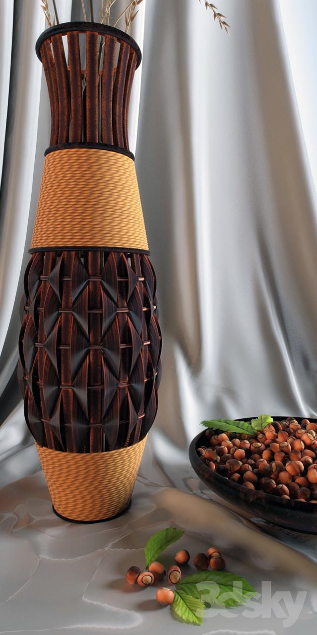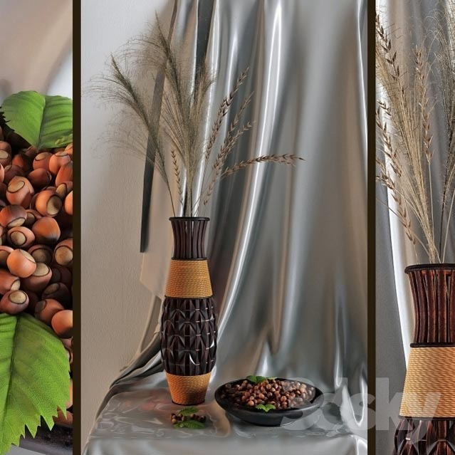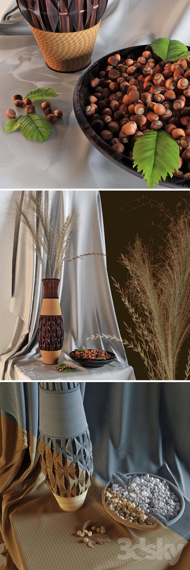 Decorative set with woven bamboo vase, hazelnuts and dry a bunch of herbs in the archive: Vase - 45642 Faces bowl with nuts and leaves - 326,677 Faces Nuts with leaves on the table - 6133 Faces Bouquet of dry grass: • spike - 6858 Faces • whisk - 437994 Faces Drapery - 74595 Faces 3d max2012 vray FBX + texture + library materials Size 3d max a file-45 MB (without herbal bouquet - 24 MB) The size of a file-FBX FBX 59 MB without anti-aliasing, you must add TurboSmooth