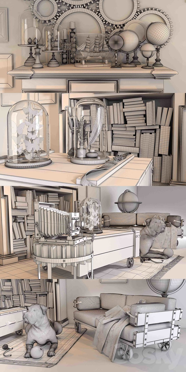 阁楼装饰套装 所有装饰品、书籍、灯具、家具、框架、狗、地毯、墙壁:包括 纹理:包括所有纹理 展开 UVW:是 单位:Sm。 渲染:V-Ray 格式:3Ds Max 2010,OBJ 多边形:1,518,945 垂直:1,487,238