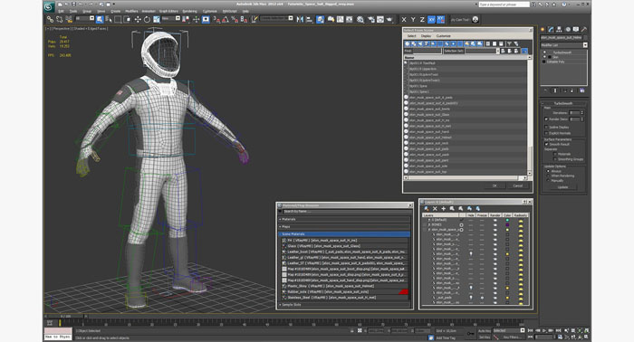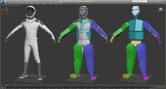 3D Studio Max中的未来派太空服已完全装备了骨头和皮肤系统。