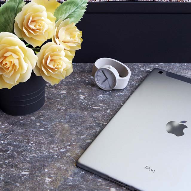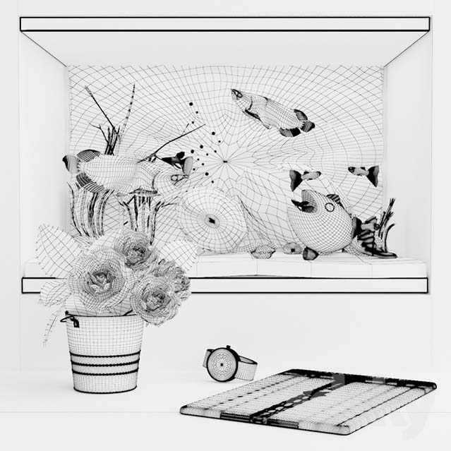 decorative set, flowers, vase, bucket, rose flower, yellow, clock, oclock, wrist watches, the tablet, ipad, mini, apple, a rock, branch, seaweed, a fish, water, aquarium, arovana, gupiki