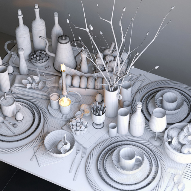 该模型是在平滑下部分制作的(禁用了Turbosmooth)。场景中的所有对象都按逻辑分组。视口中的纹理显示被禁用。在所有用sss材质制成的蜡烛中