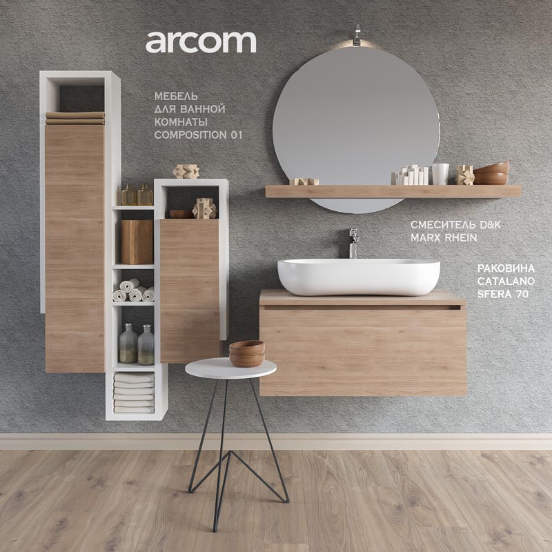 arcom, soul, composition 01, catalano, sfera, d&k, marx rhein, bath, furniture, towel, washbasin, sink, bath cabinet, accessories, mixer, shampoo, ointment, vase, decoration, chair, a cup, dekor, shelves, glass