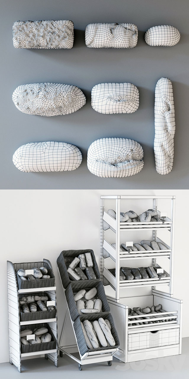 面包货架。 在文件中:-3种类型的面包架子,-8种类型的面包(预览2)529至3600多边形的逼真的面包,不使用位移,仅法线贴图,纹理2048x2048。 存档中还有一个Vray版本。