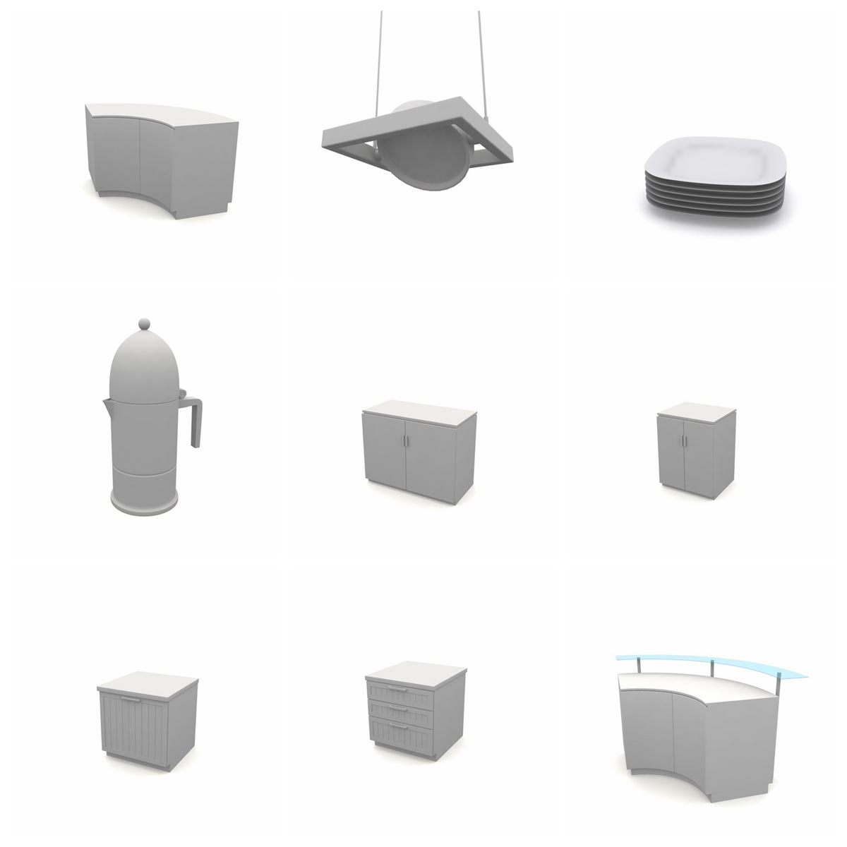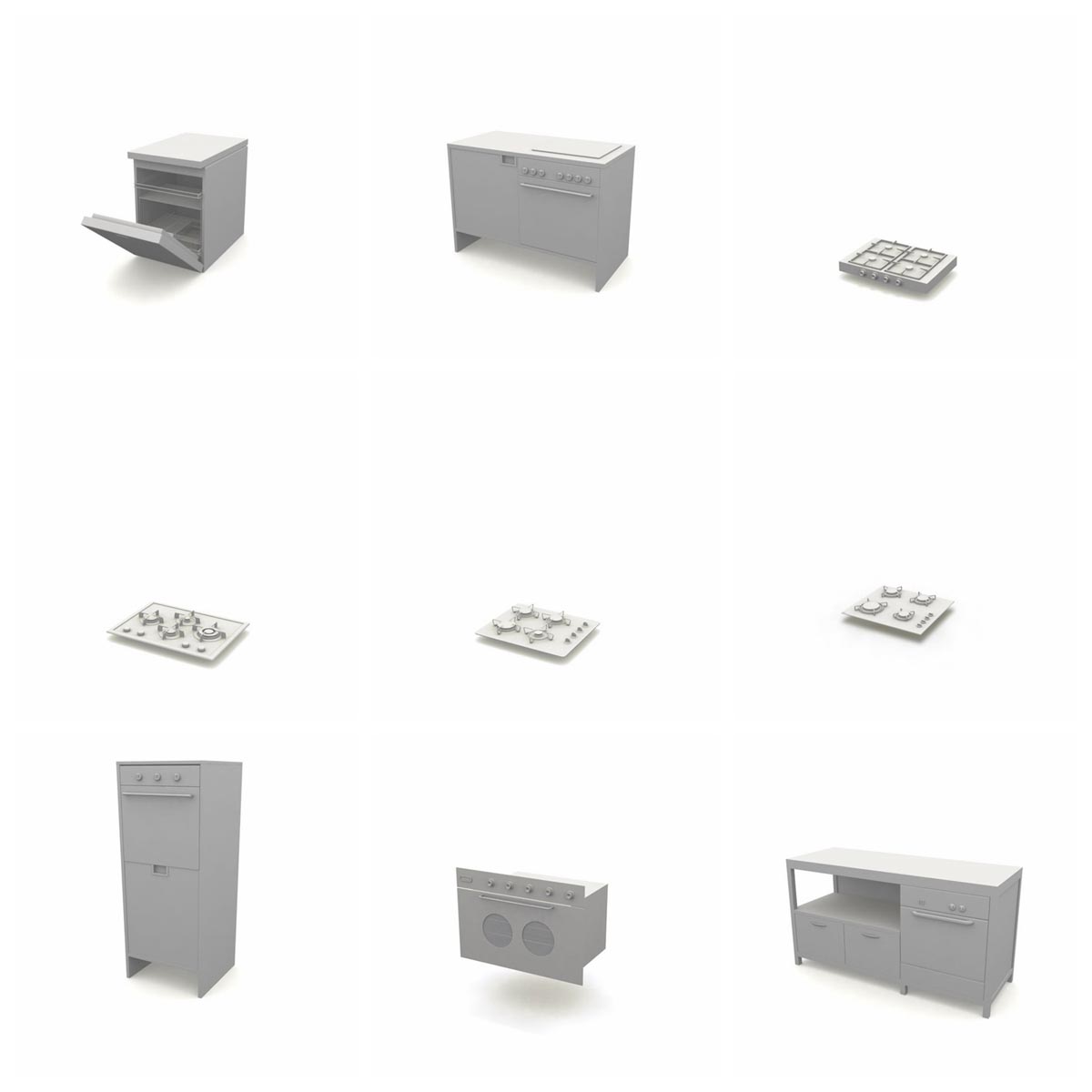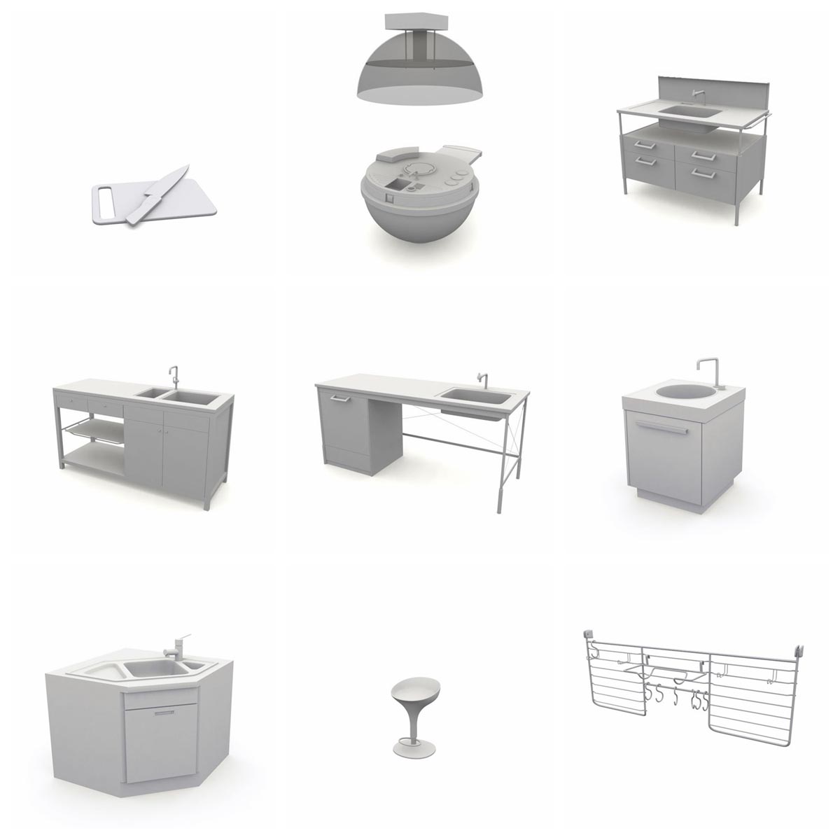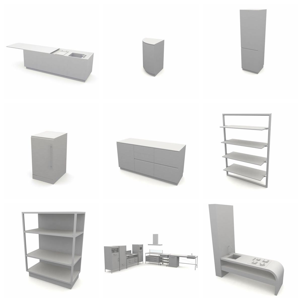 这个系列有134种型号的炊具,抽油烟机,冰箱,炉灶,水槽,椅子,盘子,微波炉。不包括场景。