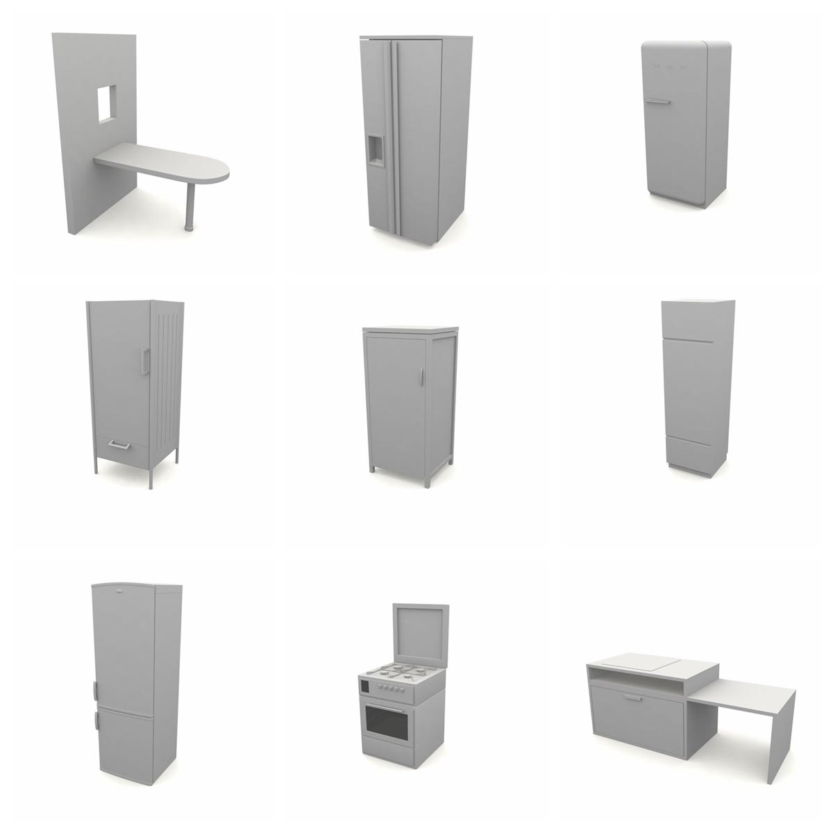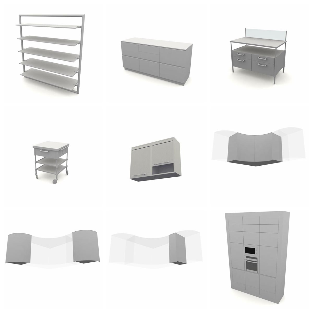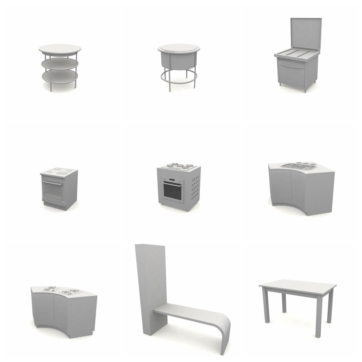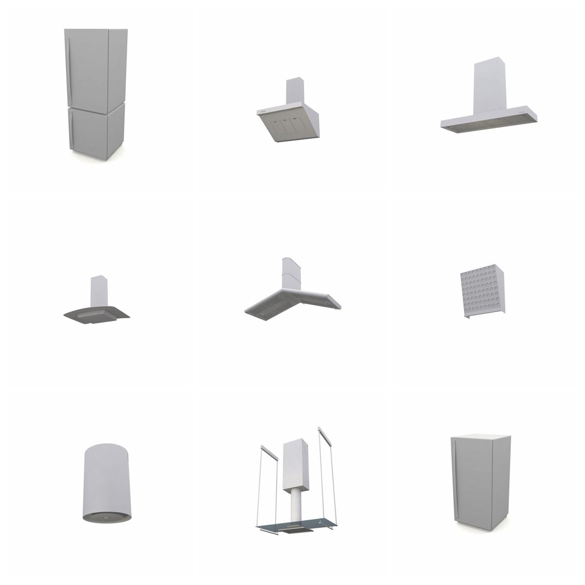这个系列有134种型号的炊具,抽油烟机,冰箱,炉灶,水槽,椅子,盘子,微波炉。不包括场景。