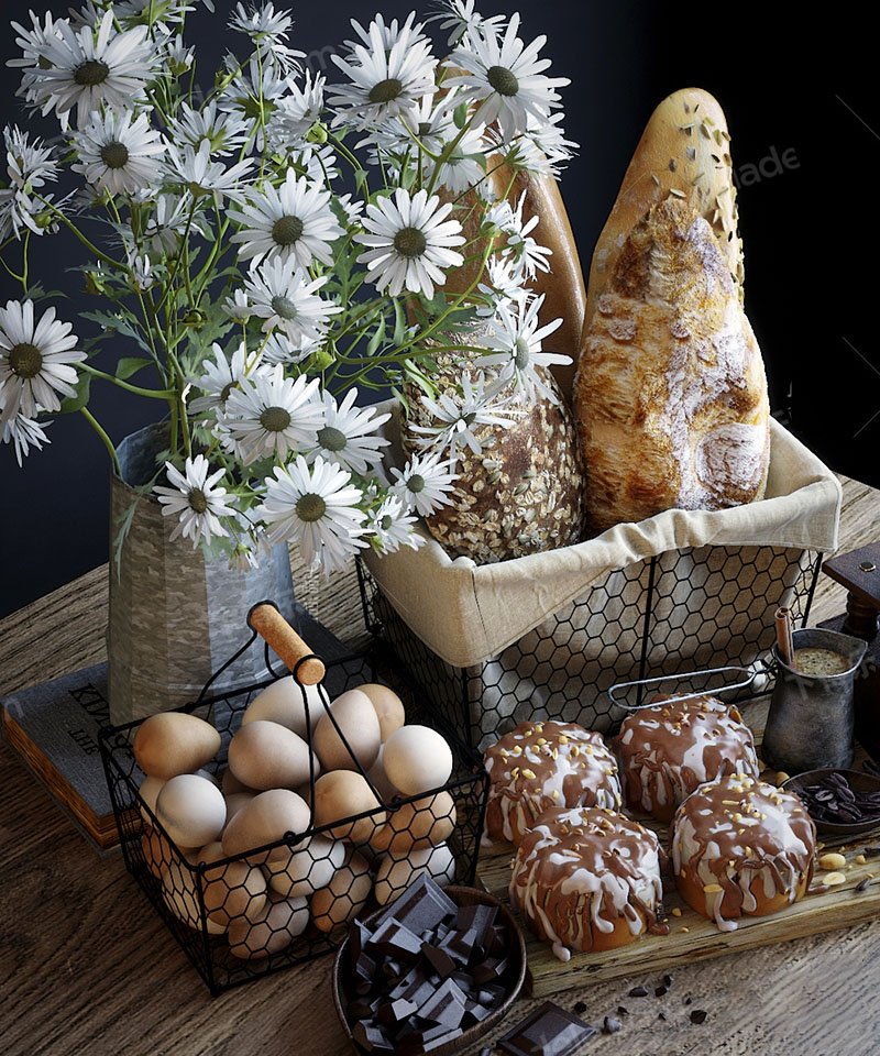 现代面包鸡蛋蛋糕和花卉美食素材之家精选3D模型