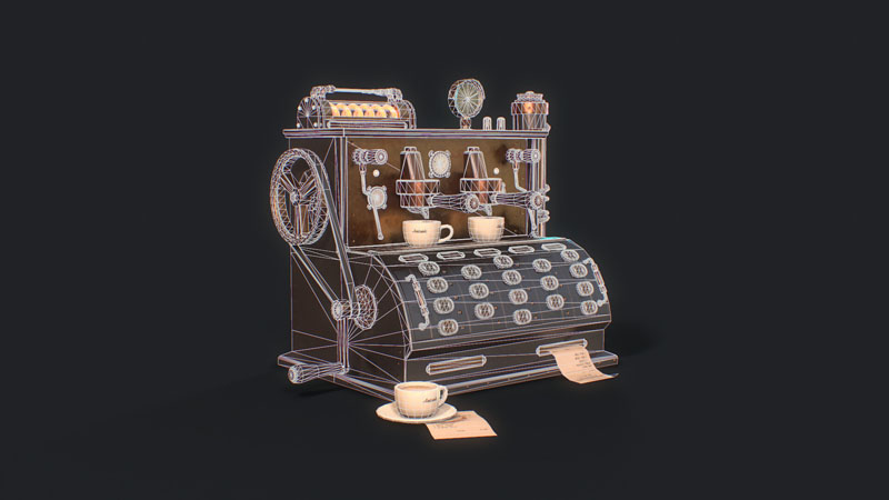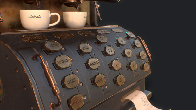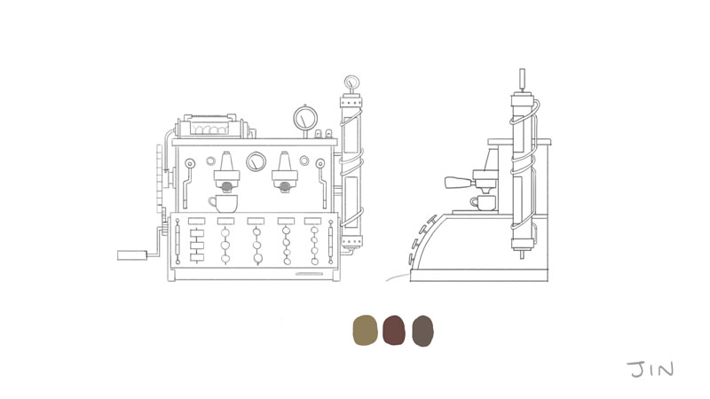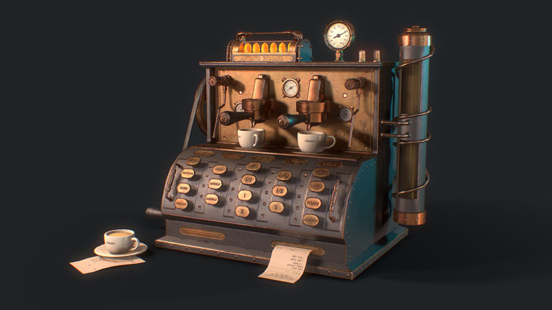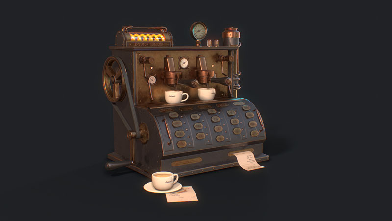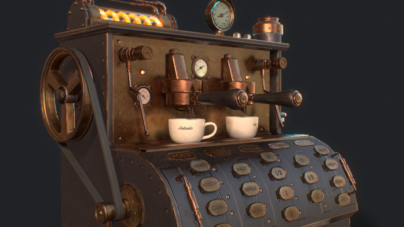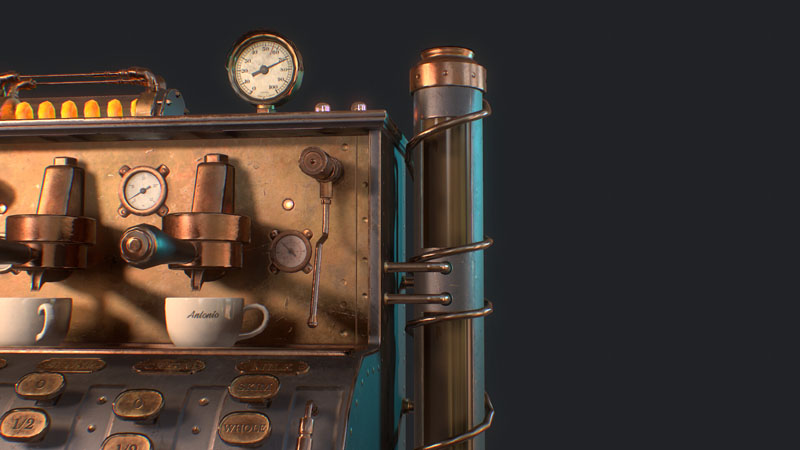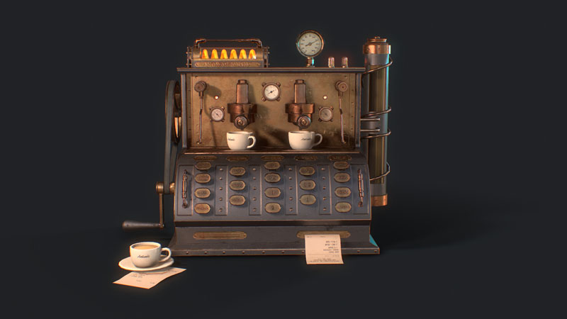 为此任务,Jamin Shoulet教授给了我关于这台咖啡机的主题和故事,这是一台1920年代过度设计的意式咖啡机。 任务是在3周内对机器进行概念,建模和纹理处理。
