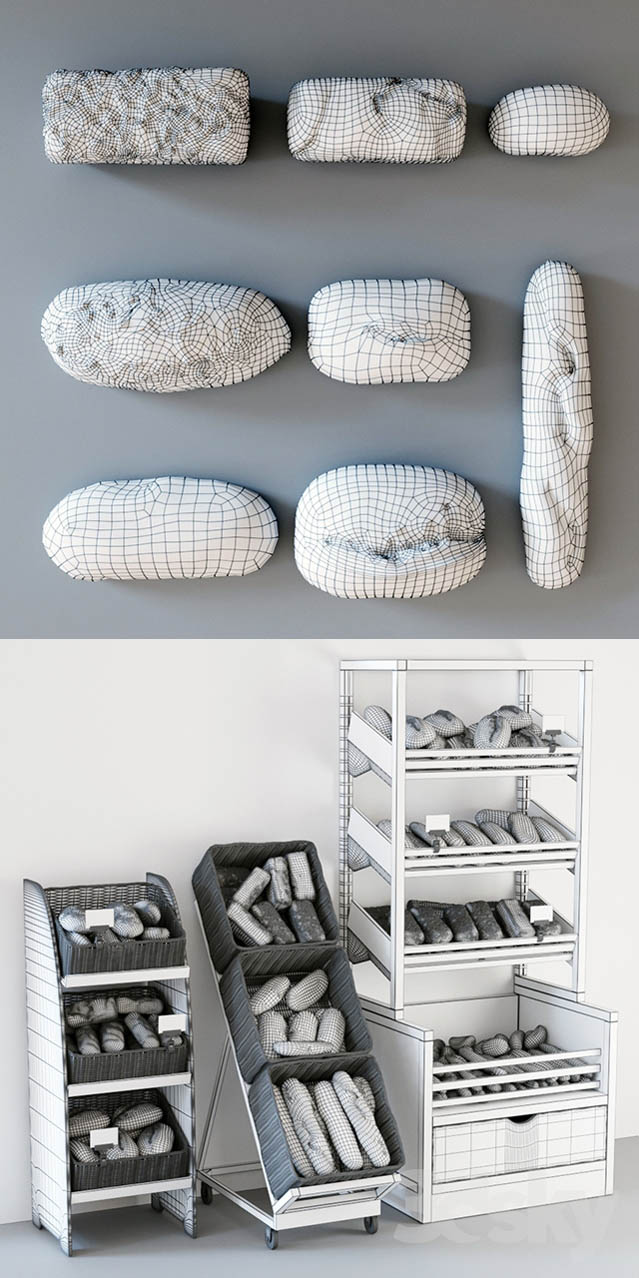 Shelves with bread. In the file: - 3 types of racks with loosened bread, - 8 types of bread for self-use (preview 2) Photorealistic bread from 529 to 3600 polygons, without the use of displacement, only normal map, textures 2048x2048, grid on the preview. There is also a Vray version in the archive.