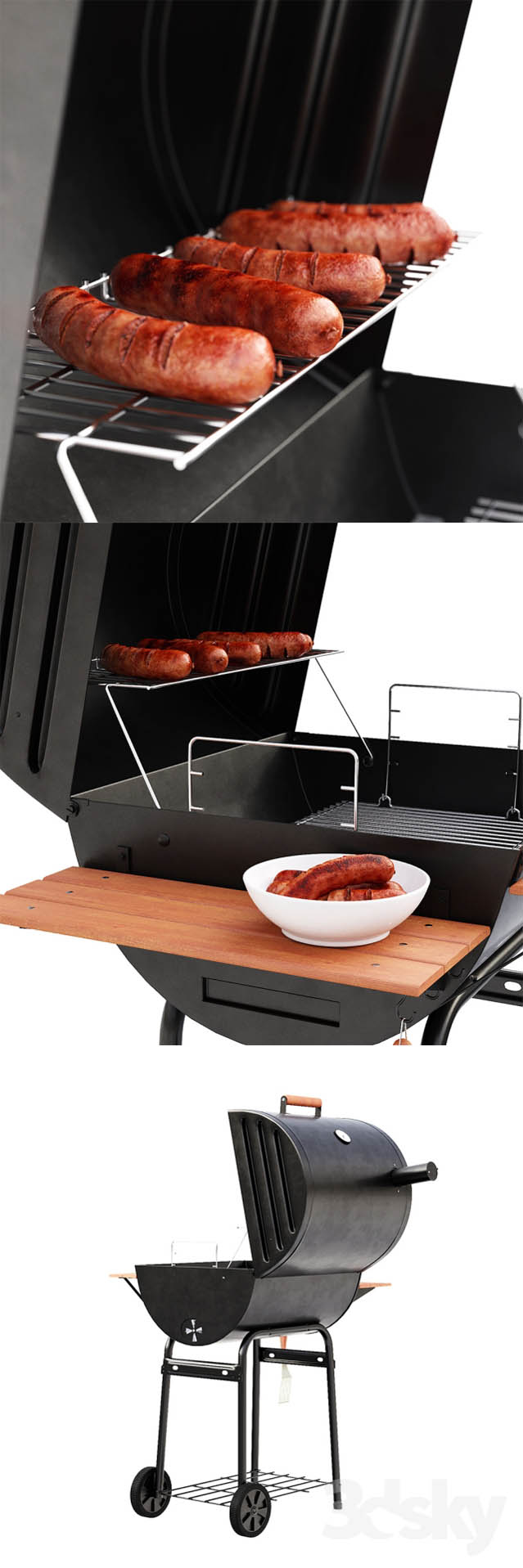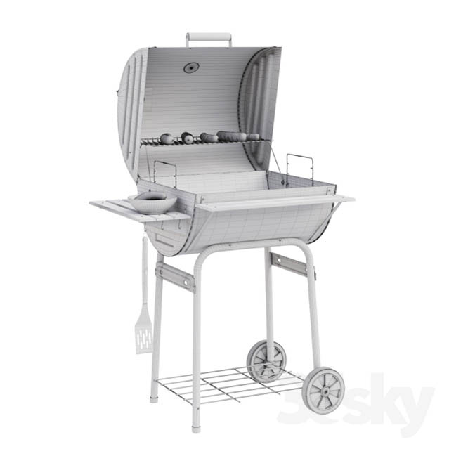 Grill Model Char Griller Wrangler with sausages. The archive contains two files with the models for VRay and Corona renderer. Polys: 355 258 Verts: 293 688 Note! In the version for disabled VRay displacement on the sausages. Inner-angle or close-up pictures is recommended to include. Displacement map attached.