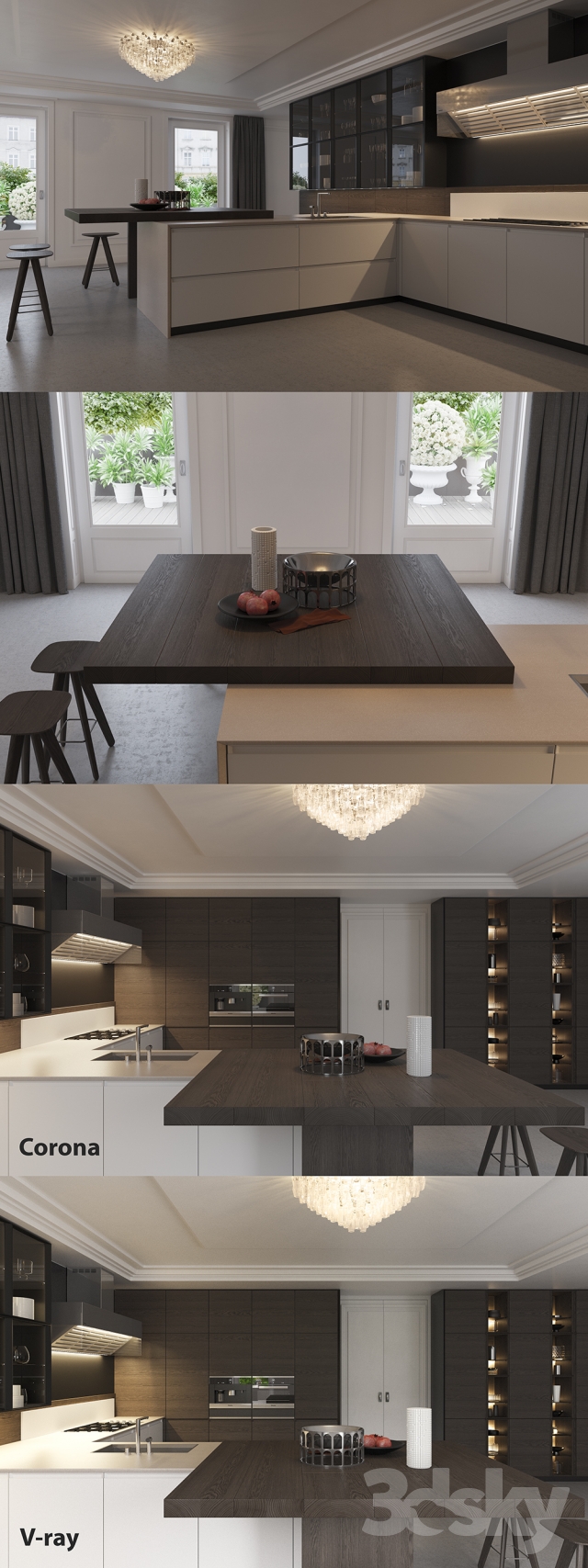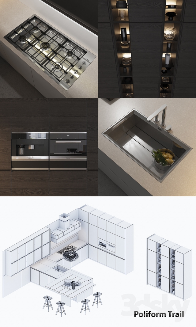 Kitchen Poliform Varenna Trail equipment and filling, made for corona render and vray 3.2. The equipment includes: washing and Barazza mixer; oven and coffee machine Miele; hob Scholtes, and the scene contains lamp Venini POLIEDRI, chairs Poliform ICS and the entire decor. In the scene 493K polygons. 33 mb The archive of high-resolution textures. In version vray, BRDF materials installed in Microfacet GTR / GGX, owners vray 2.4 must be installed in the Blinn BRDF. For Corona render, it is recommended to put