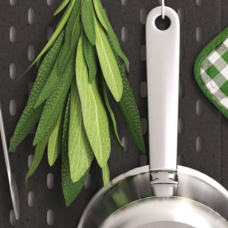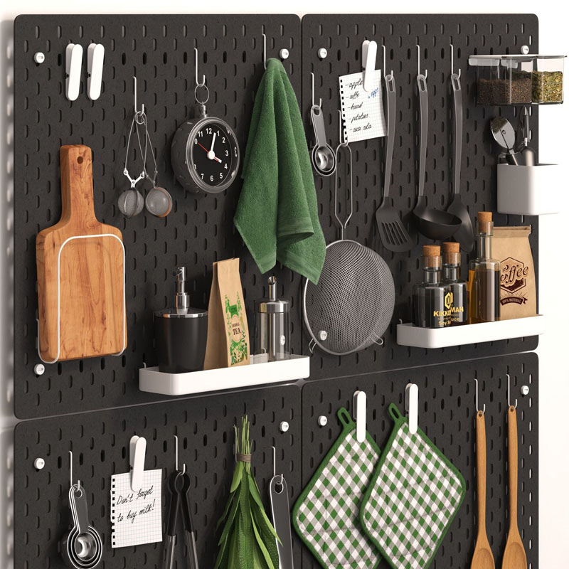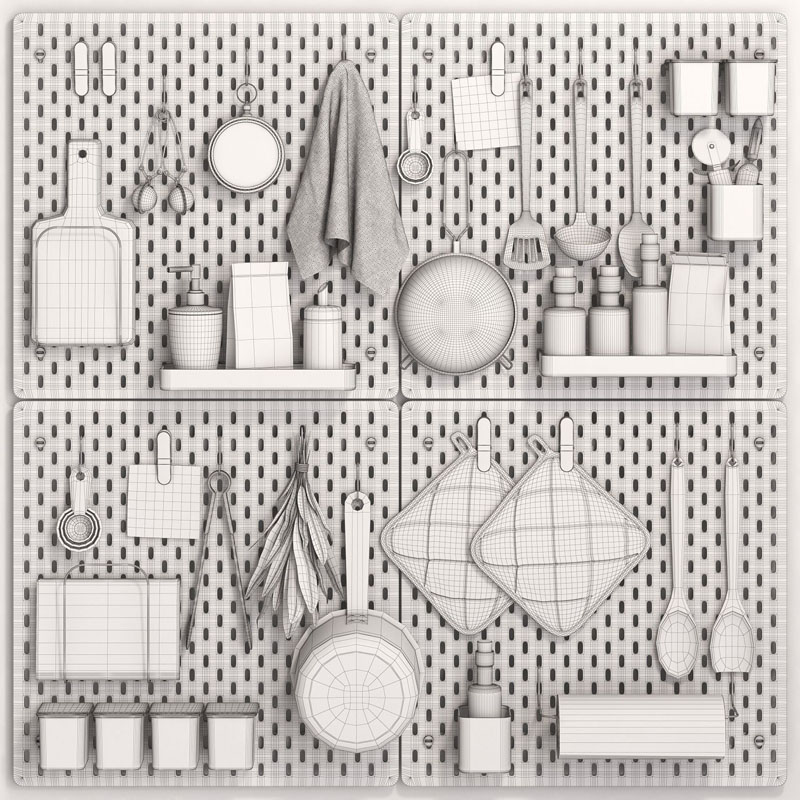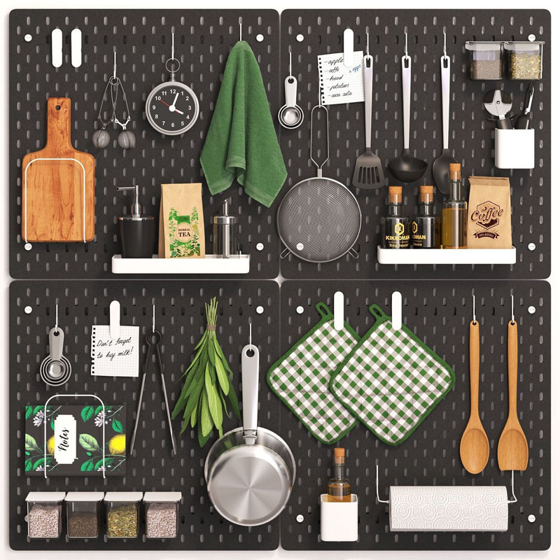 该套件包括用于厨房的各种物品,用于准备和存储食物,罐子,瓶子,毛巾,餐巾纸,食谱书,平底锅,茶和咖啡包装等等。该模型由4个面板组成,这些面板可以组合在一起并以不同的方式放置在墙上,这是一种功能强大的解决方案,它将使存储尽可能方便。