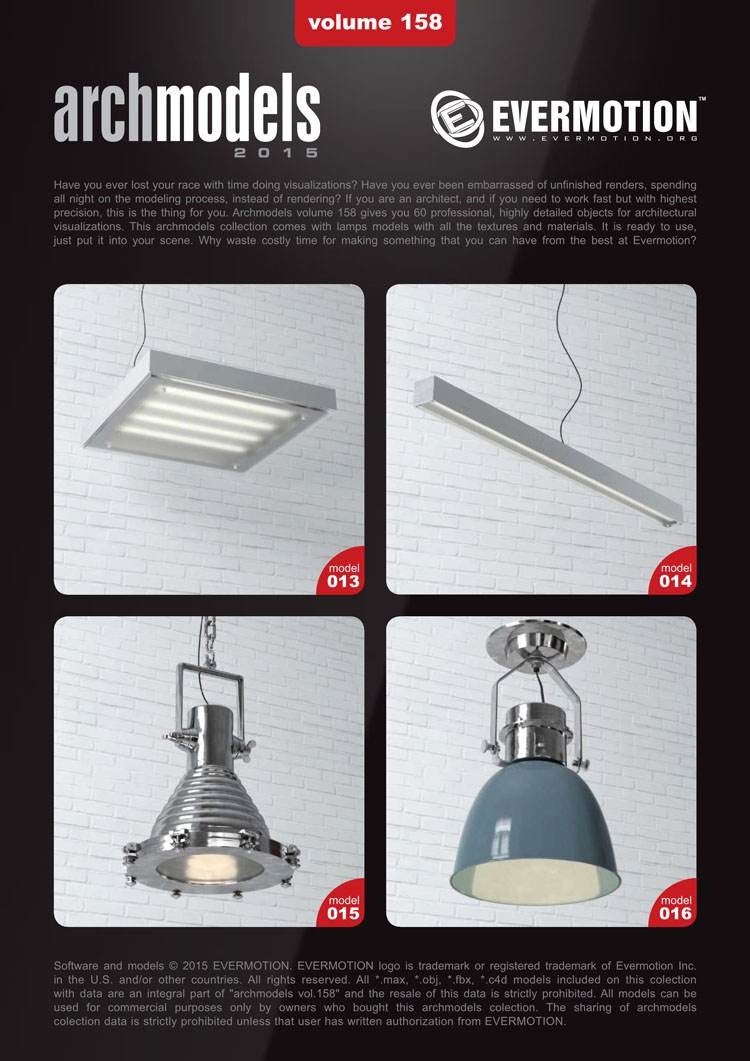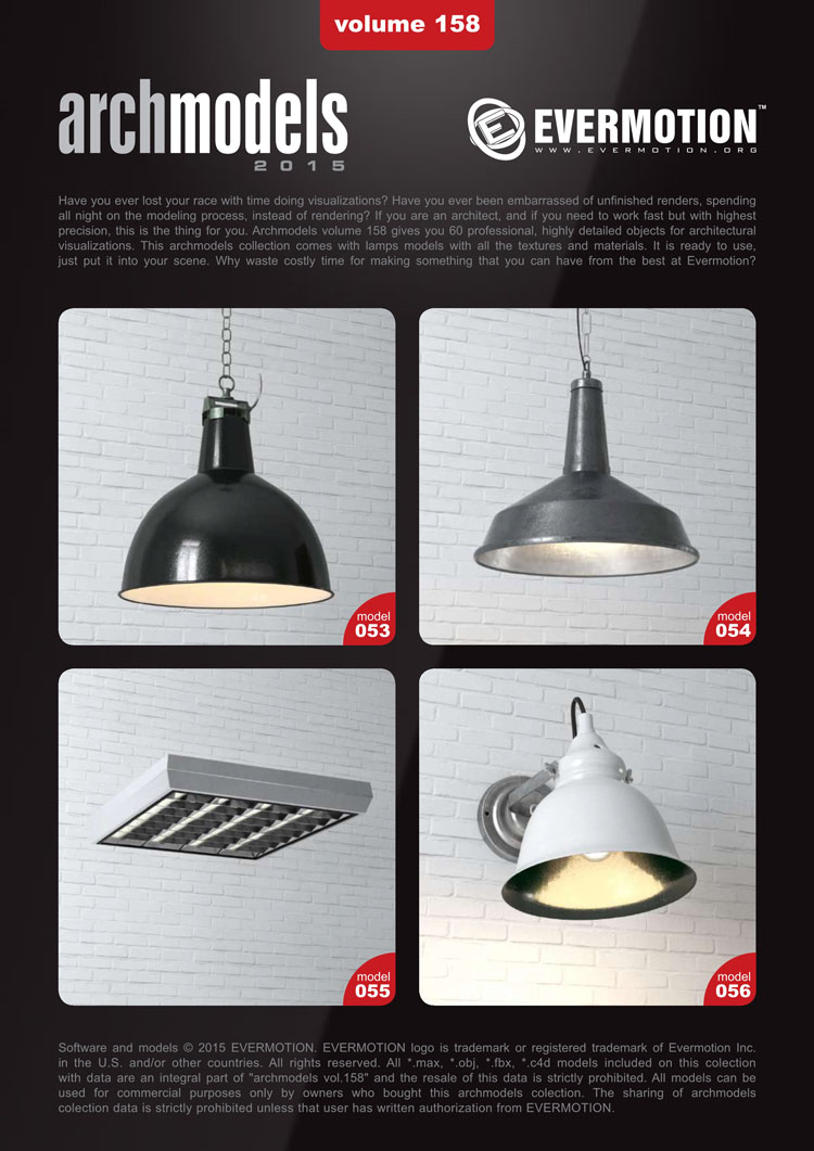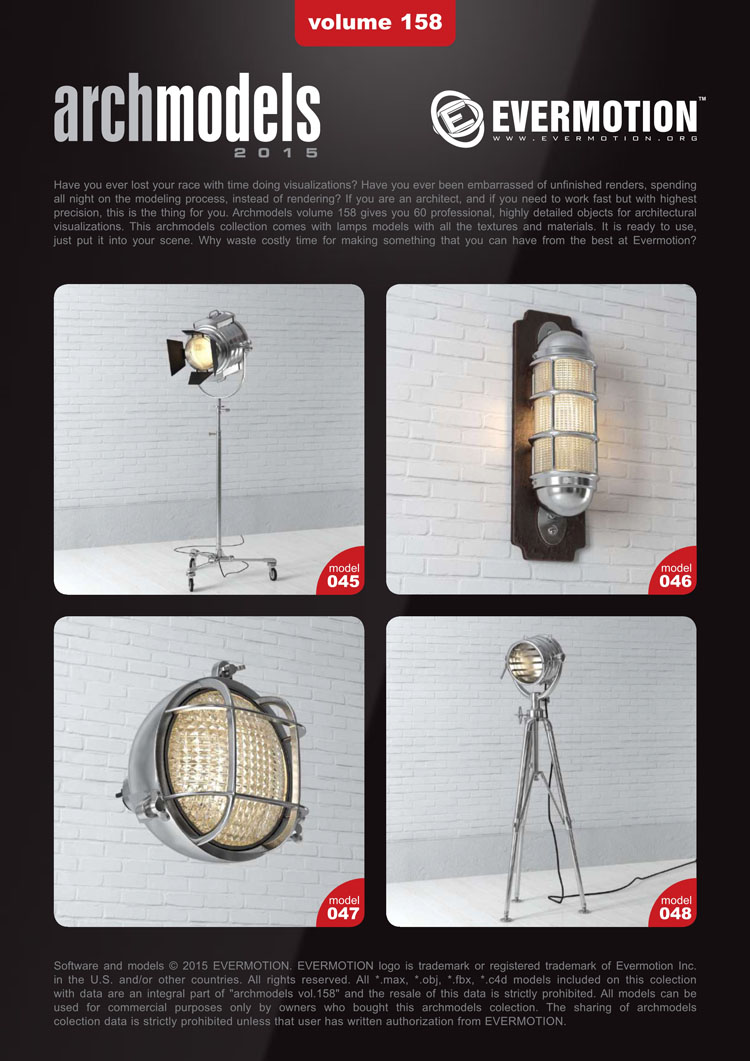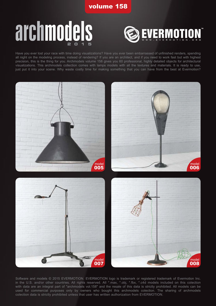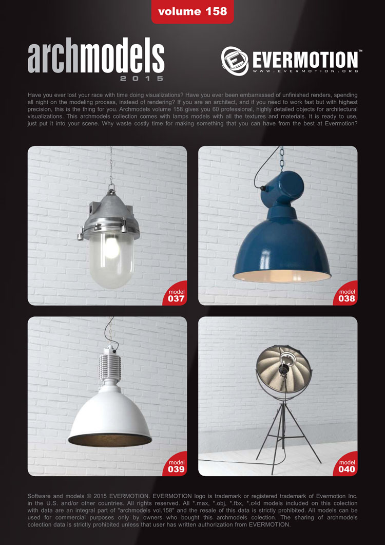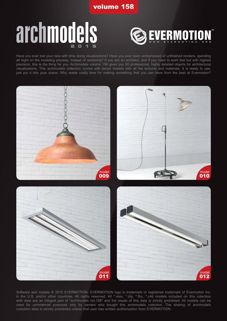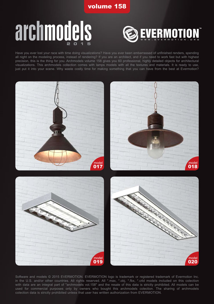 Archmodels 卷。 158 包括 60 个用于建筑可视化的专业、高度详细的 3d 模型。 该系列配有高品质的室内照明模型。 所有对象都可以在您的可视化中使用。 展示的模型和场景使用 3ds max 在 V-ray 中渲染。 不包括场景。 Archmodels 卷的介绍。 158