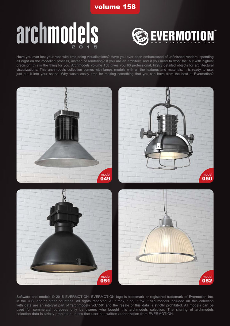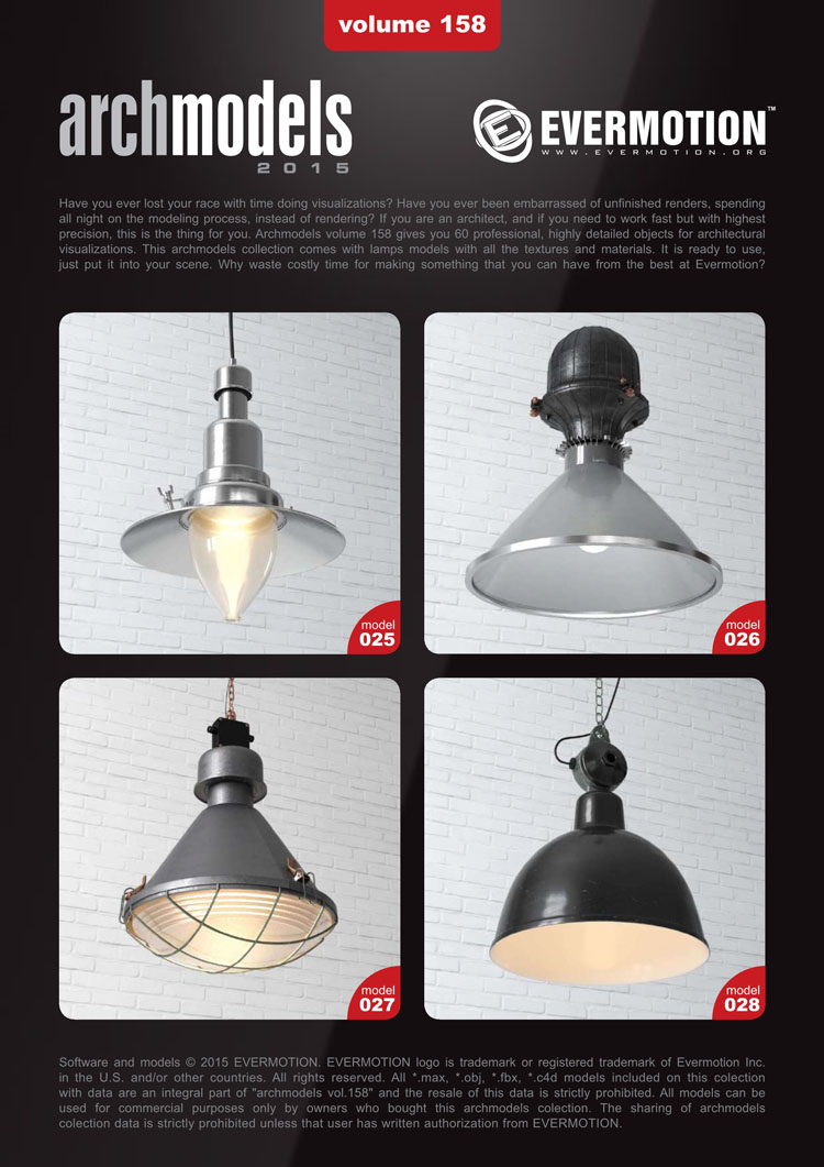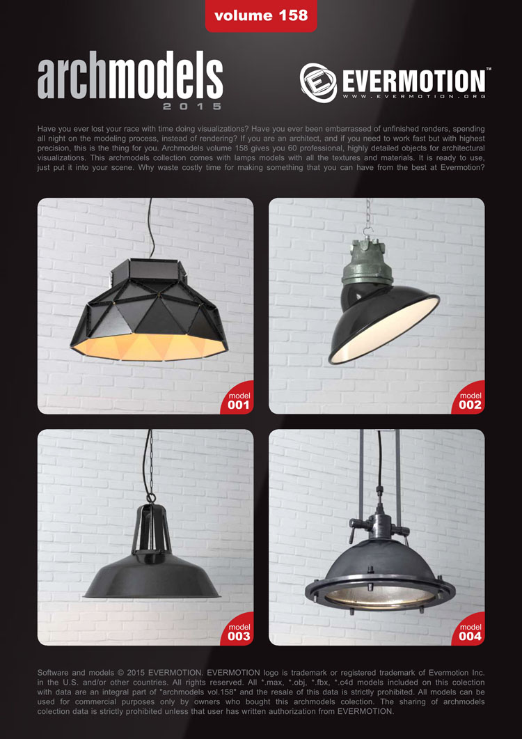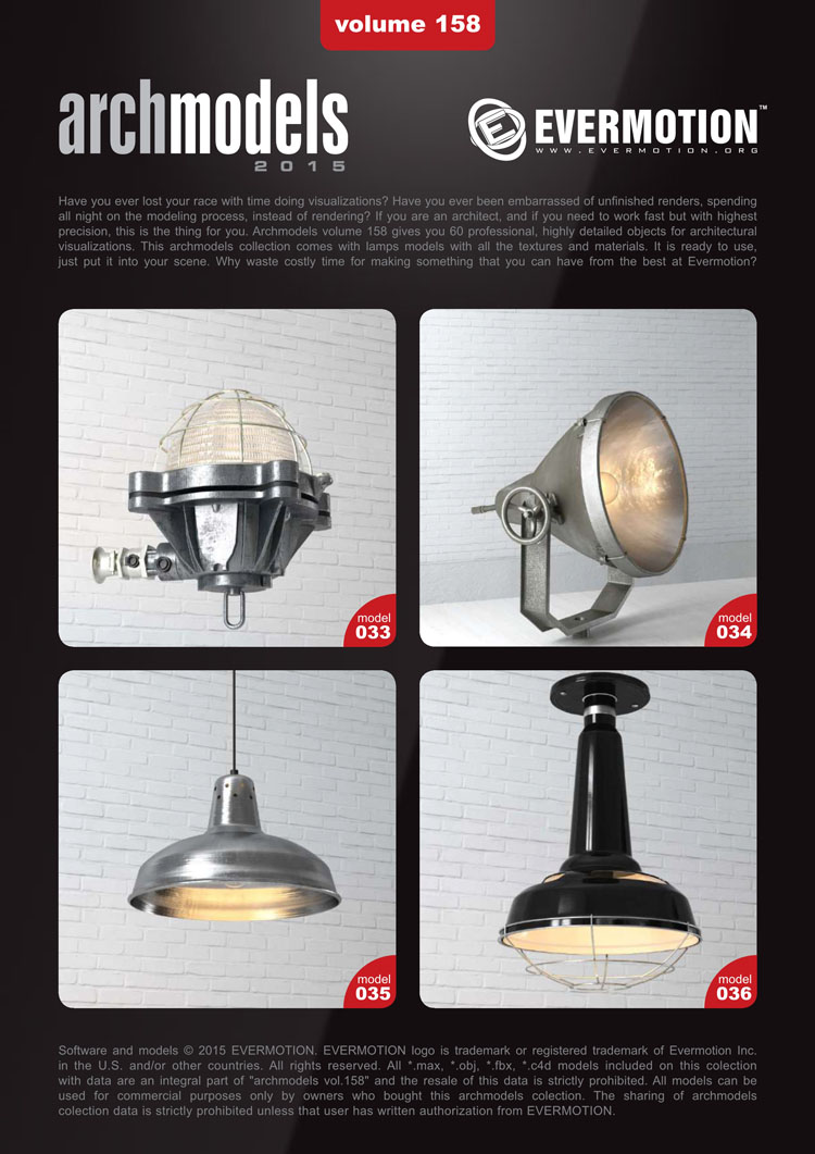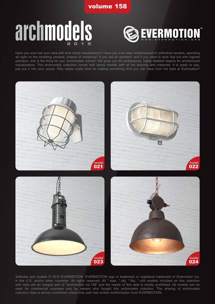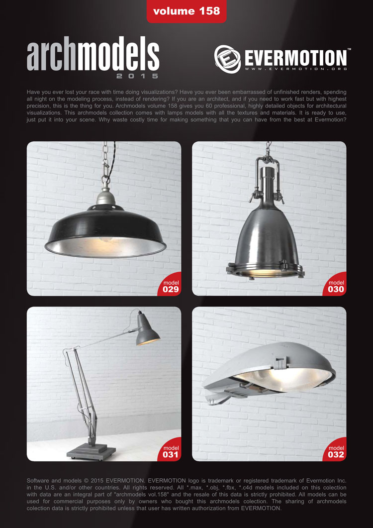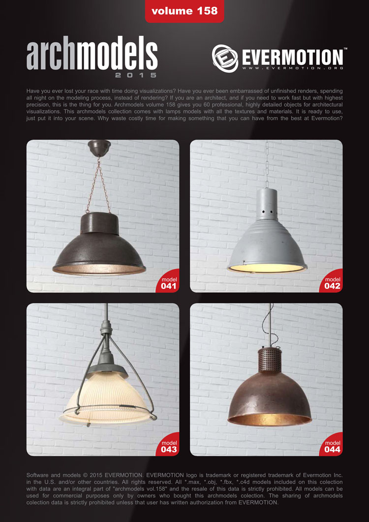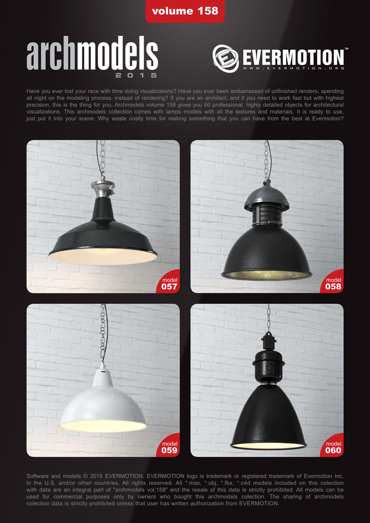 Archmodels 卷。 158 包括 60 个用于建筑可视化的专业、高度详细的 3d 模型。 该系列配有高品质的室内照明模型。 所有对象都可以在您的可视化中使用。 展示的模型和场景使用 3ds max 在 V-ray 中渲染。 不包括场景。 Archmodels 卷的介绍。 158
