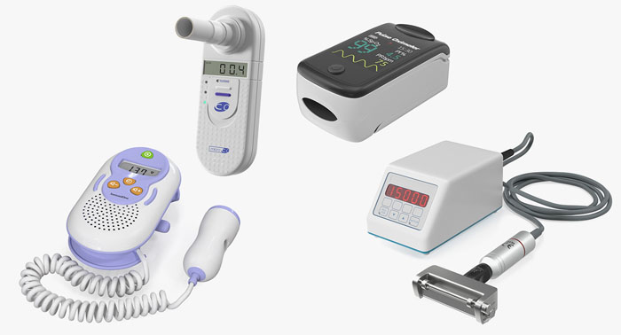 带有 MicroMedical Micro CO Monitor 的医疗设备系列是一种一氧化碳呼气测试设备,可立即显示 PPM 和 %COHB 中的一氧化碳水平,彩色指示灯; Sonicaid One Rate Display Fetal Doppler 一种产前儿童保健诊所医疗诊断设备;专业指尖脉搏血氧仪是一种间接监测患者血液氧饱和度的医疗设备;和 DeSoutter Medical GD 系列气动皮刀设备,带皮刀头和特殊控制器系统。