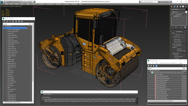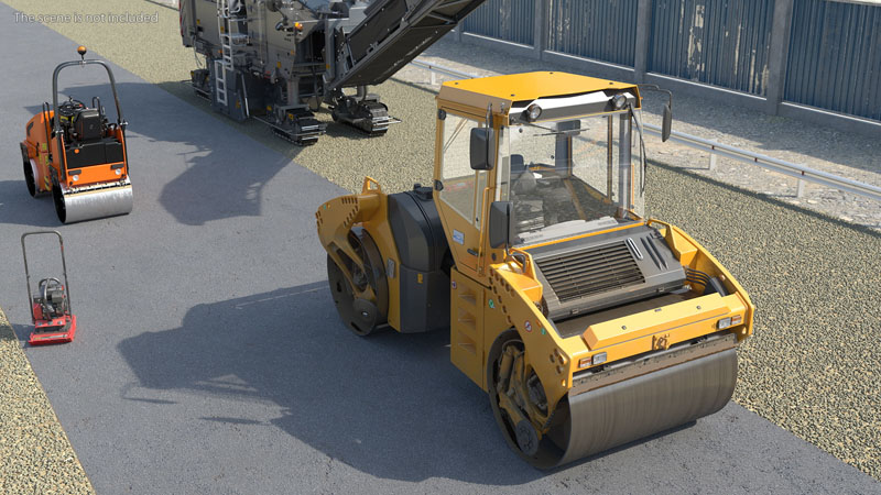 铰接式串联压路机 3d 模型已准备好进行动画制作。您可以使用 3D Studio Max 中的助手轻松按您需要的方式定位它或按照您的项目需要的方式对其进行动画处理。