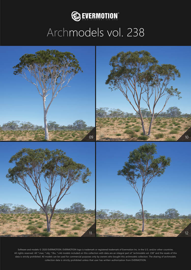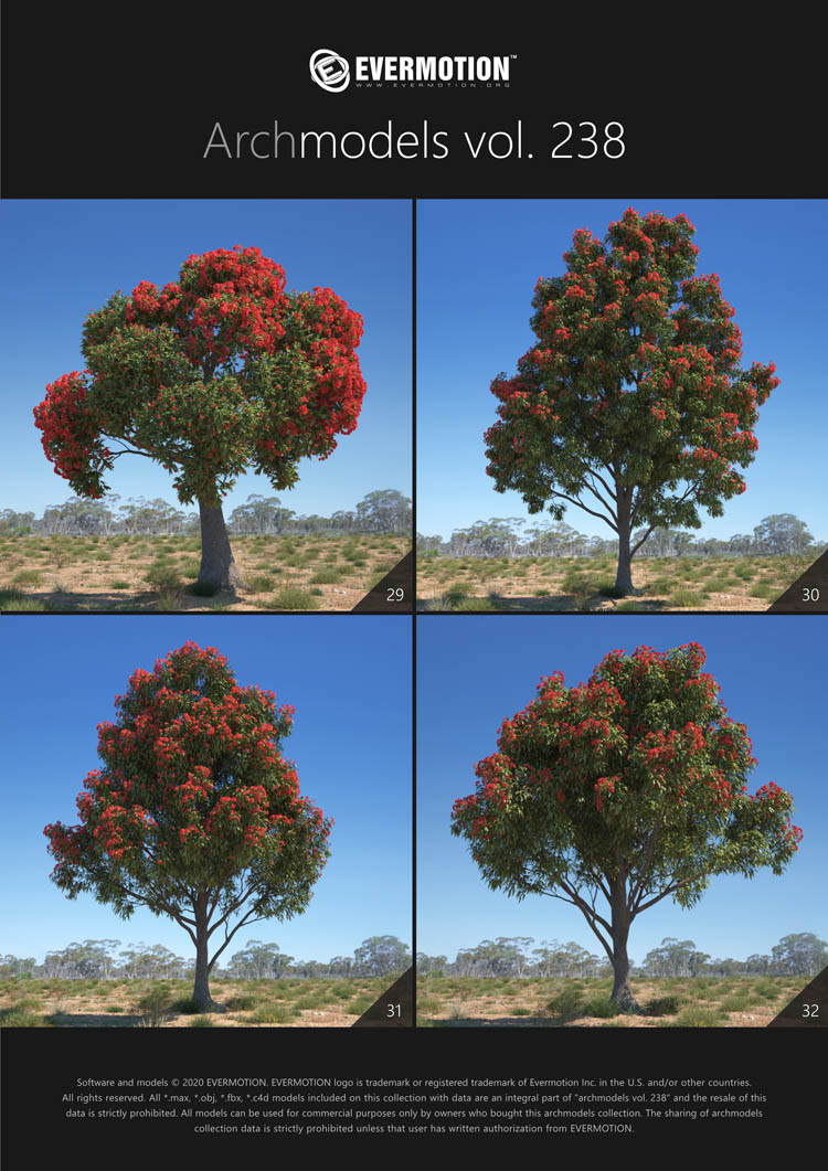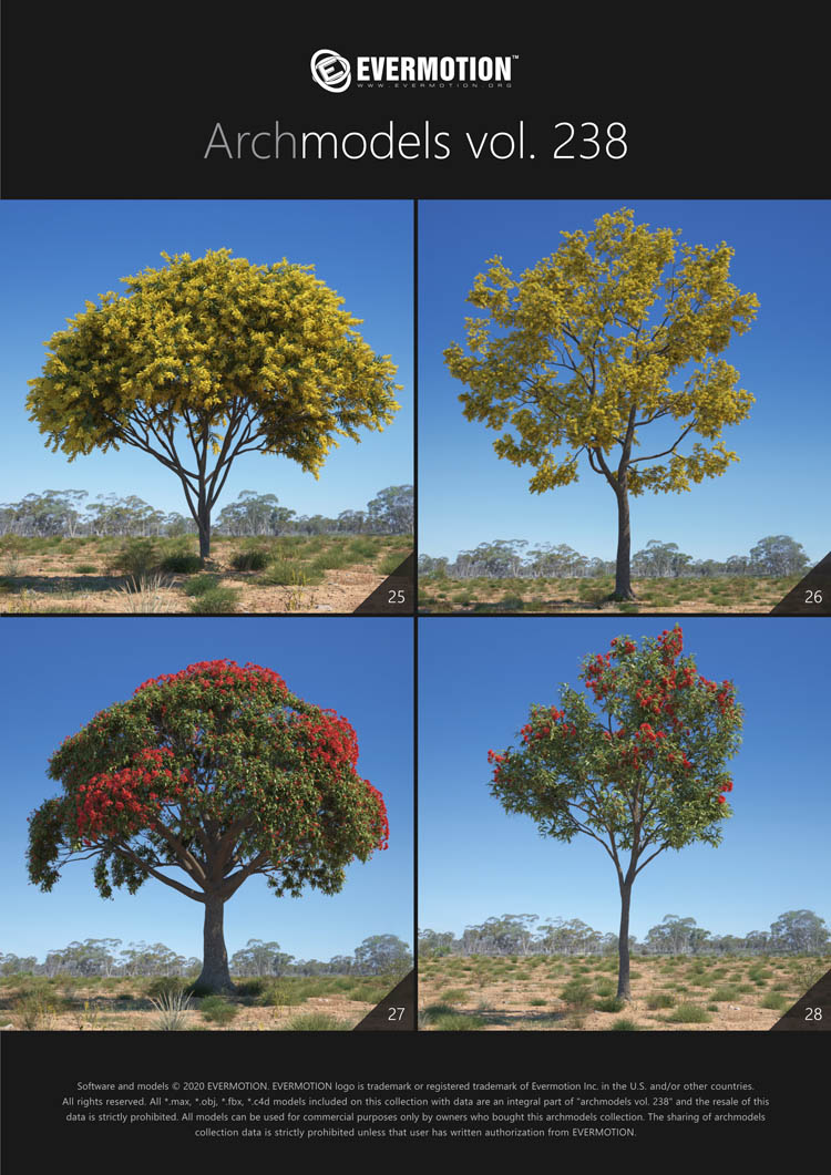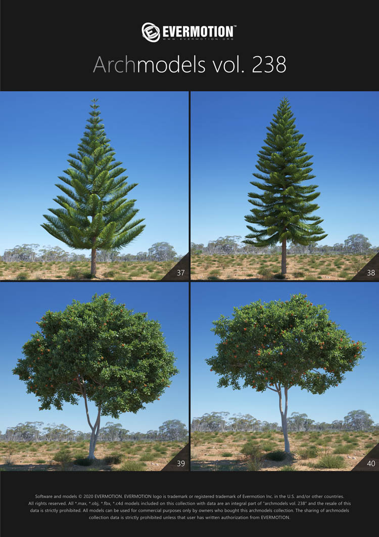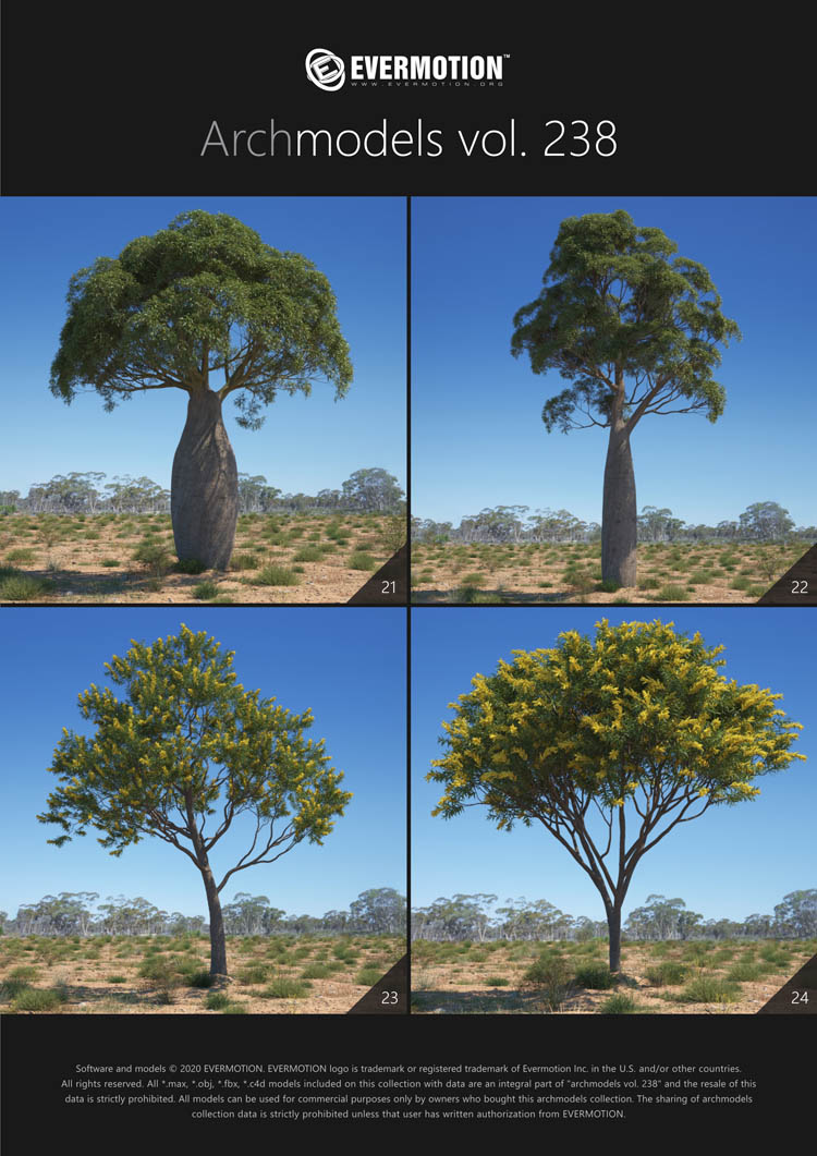 建筑模型卷 238包括用于建筑可视化的44个专业,高质量3d模型。 该收藏品配有澳大利亚和大洋洲生物群落典型的树木。 包括的物种:桉树,桔梗,短枝短柄蒲菜,阿拉伯树胶,枸杞,西洋参,南洋杉,拟南芥。 所有对象都可以在可视化中使用。