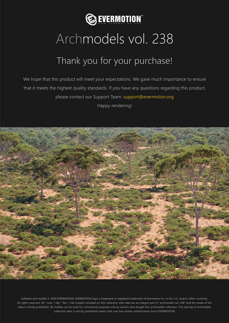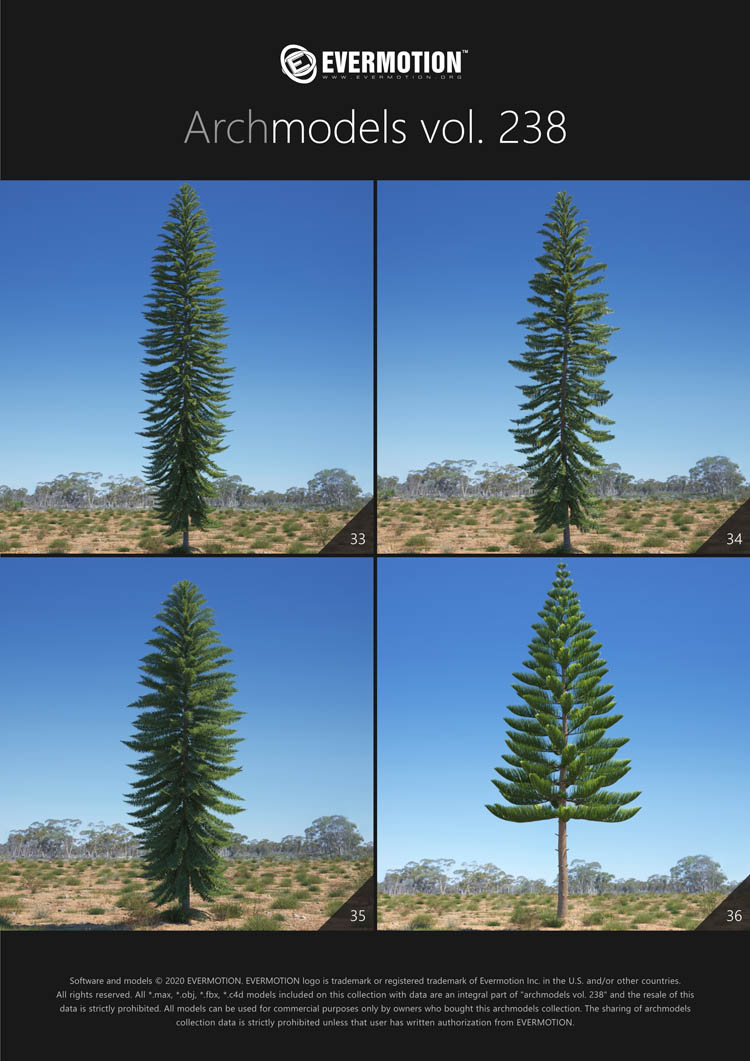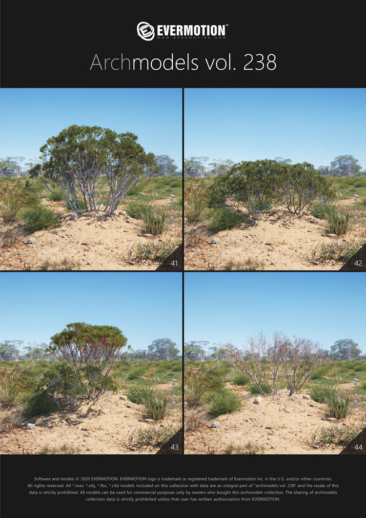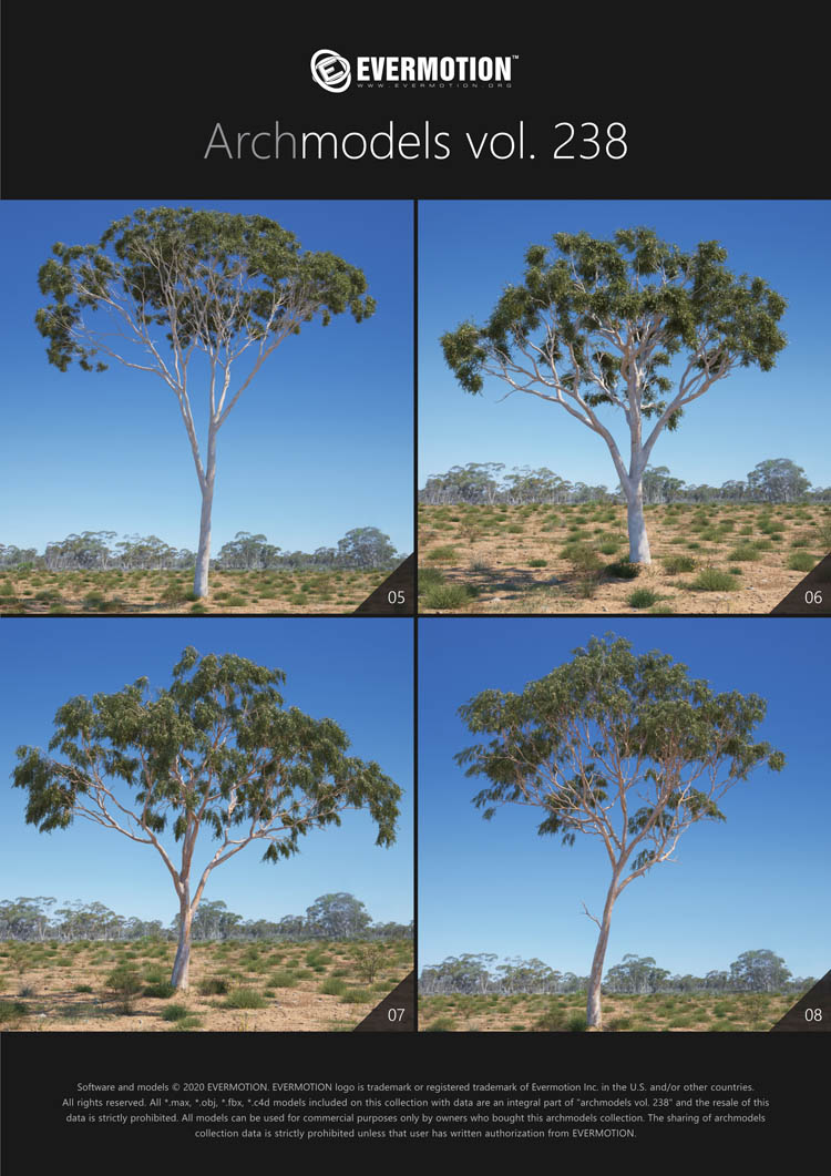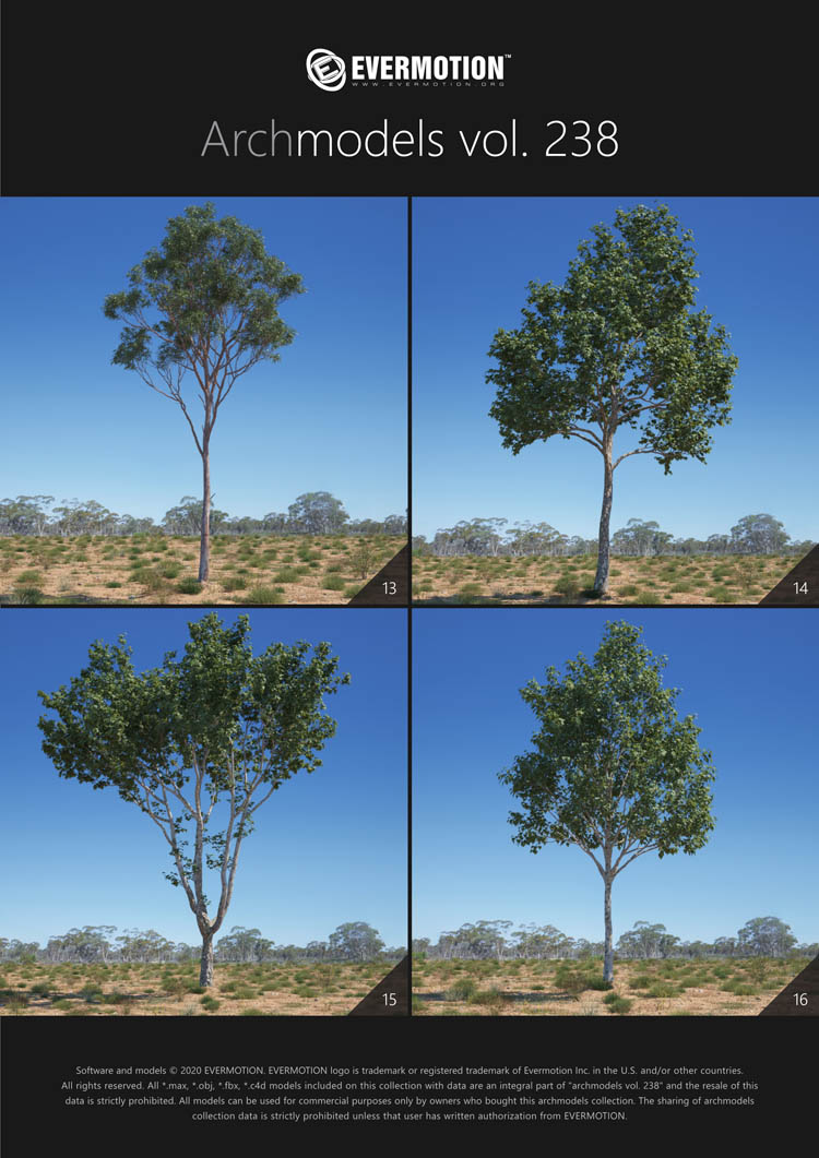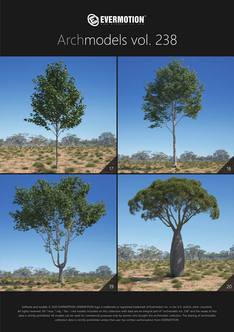 建筑模型卷 238包括用于建筑可视化的44个专业,高质量3d模型。 该收藏品配有澳大利亚和大洋洲生物群落典型的树木。 包括的物种:桉树,桔梗,短枝短柄蒲菜,阿拉伯树胶,枸杞,西洋参,南洋杉,拟南芥。 所有对象都可以在可视化中使用。