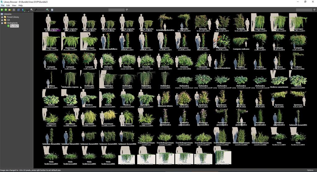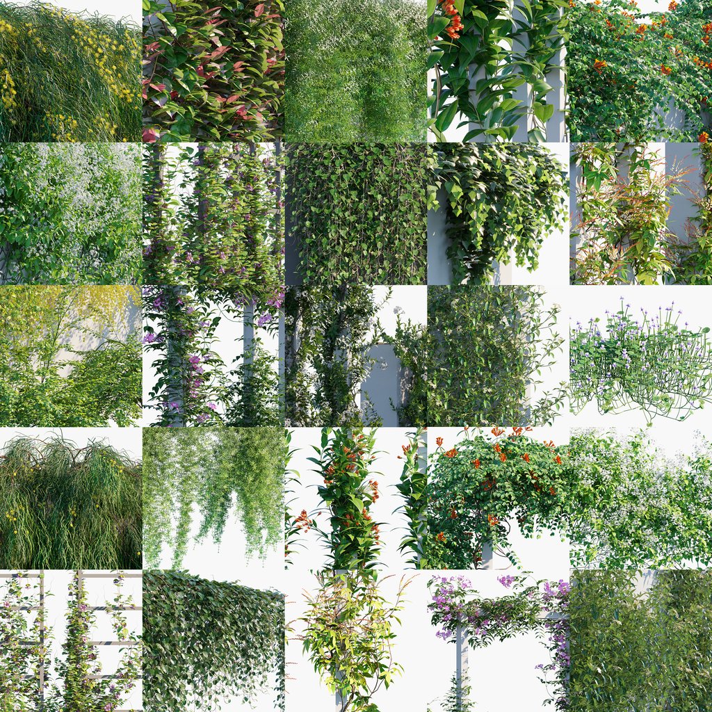 该捆绑包 23 包括 15 种用于一般景观目的的 3D 藤蔓和爬山虎,以及 108 个独特的 3D 植物模型,这些模型具有多种形式,可用于您的许多场景。