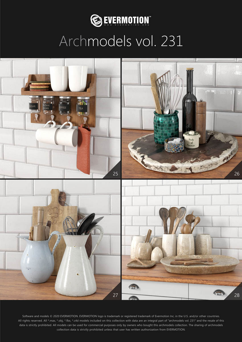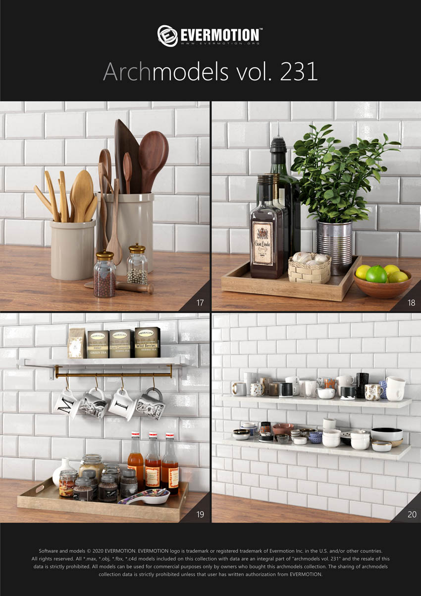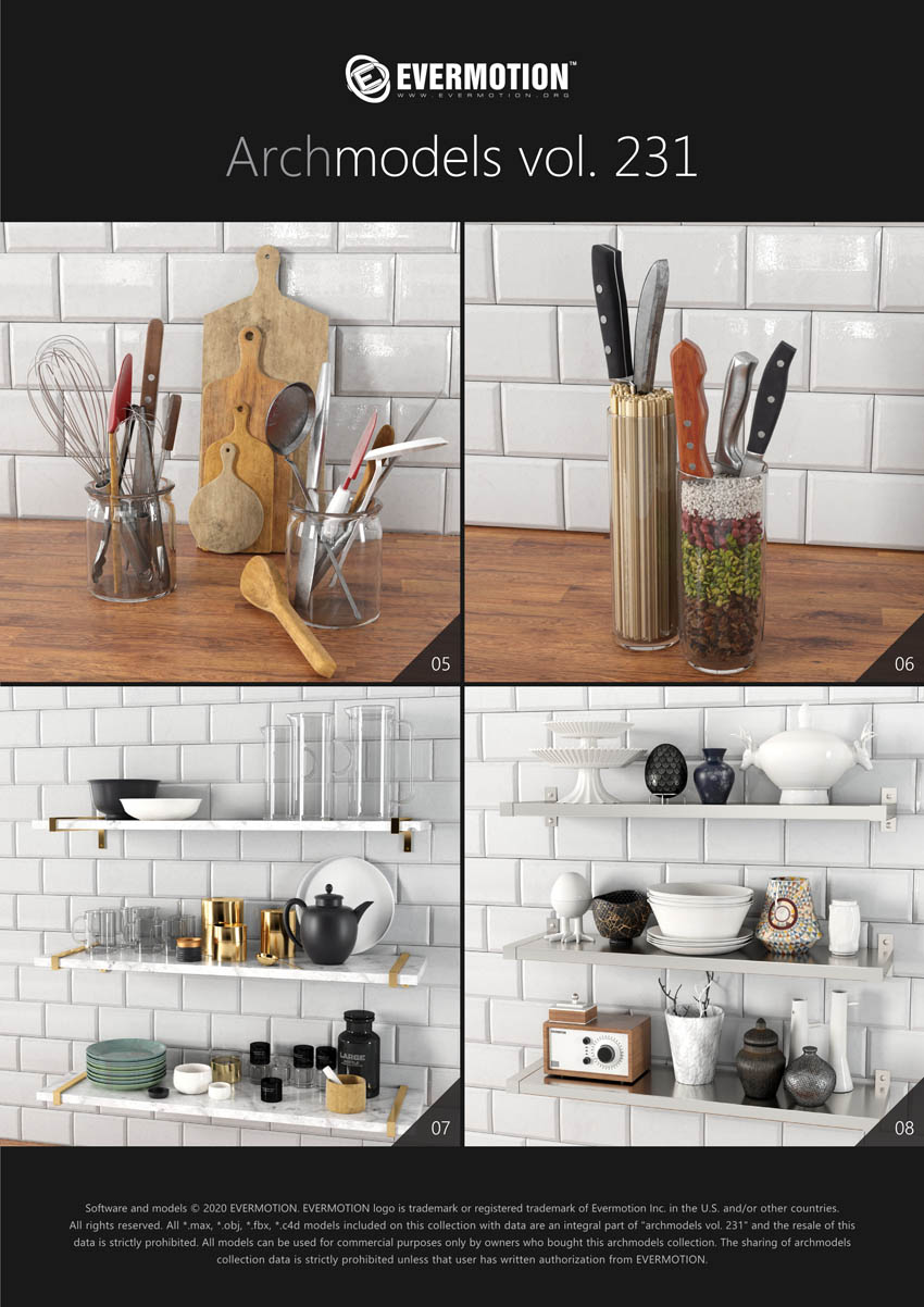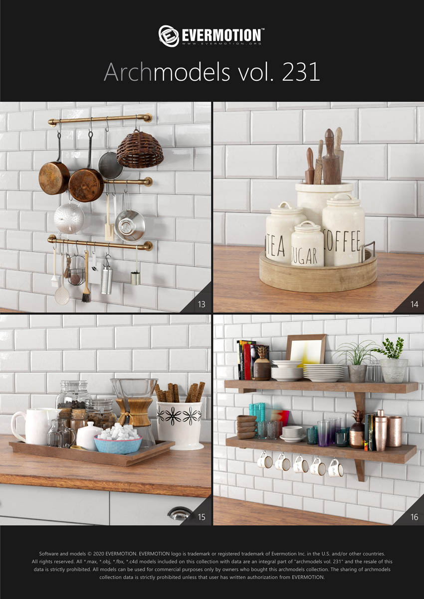 建筑模型卷 231为您提供了32个专业的,高度详细的对象,可用于建筑可视化。 该系列包括100多种型号,分为32套,可适合任何厨房内部空间(现代和复古)。 您会在这里找到厨房道具,例如餐具,瓷器,罐子,盒子等。所有对象都可以在可视化中使用。