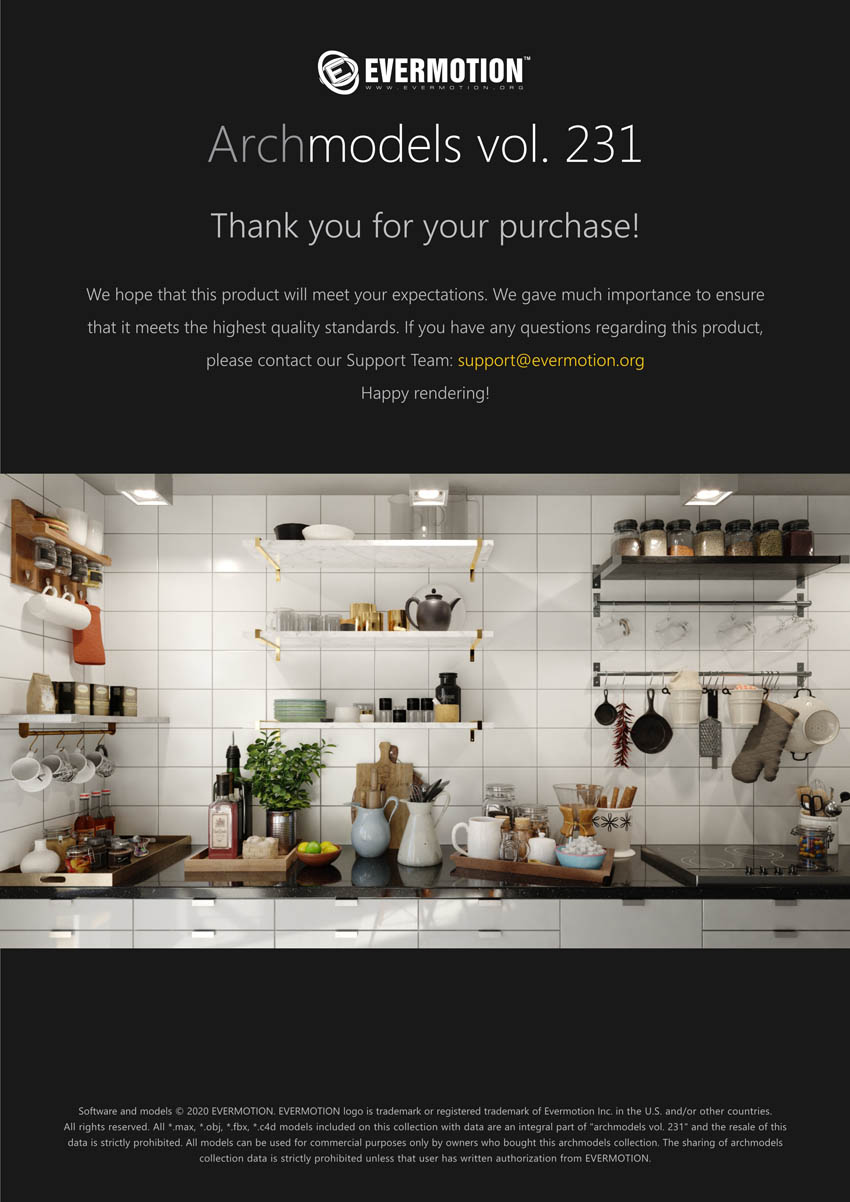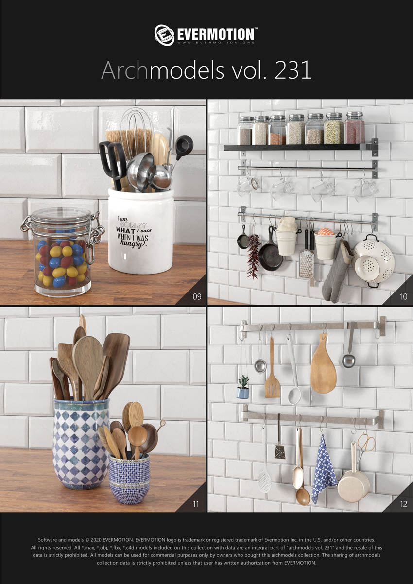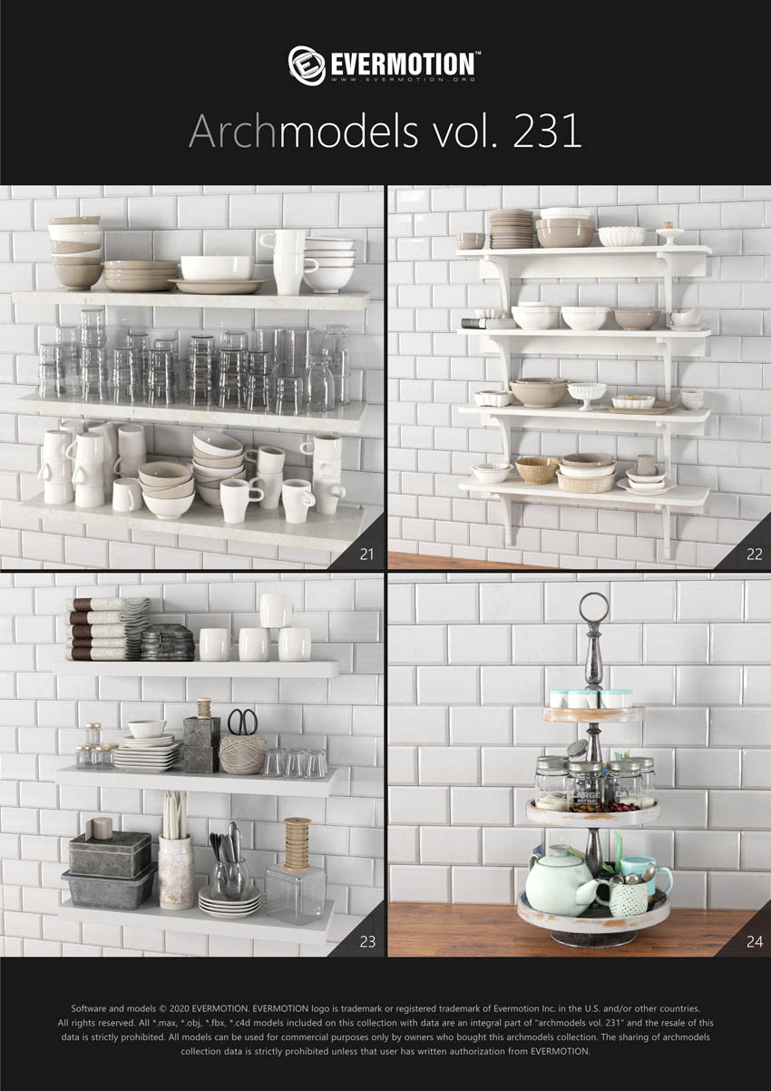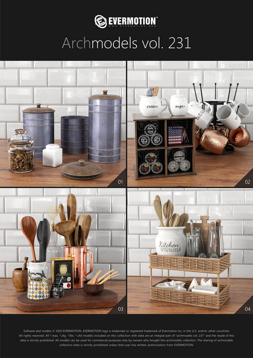 建筑模型卷 231为您提供了32个专业的,高度详细的对象,可用于建筑可视化。 该系列包括100多种型号,分为32套,可适合任何厨房内部空间(现代和复古)。 您会在这里找到厨房道具,例如餐具,瓷器,罐子,盒子等。所有对象都可以在可视化中使用。