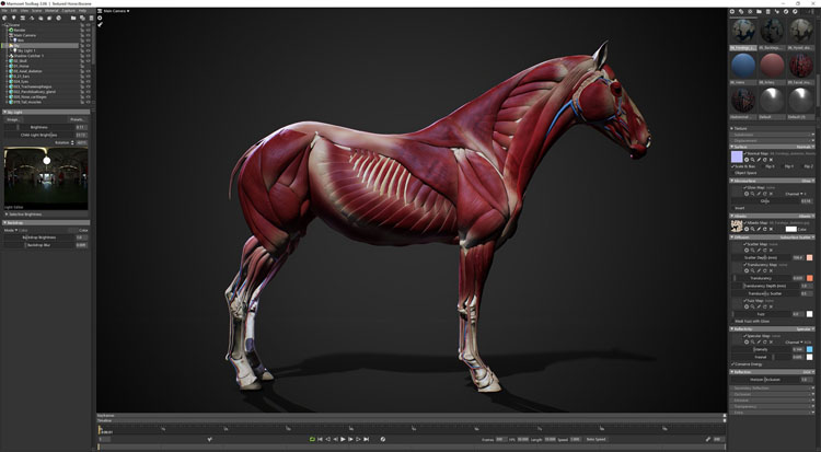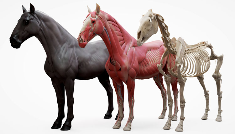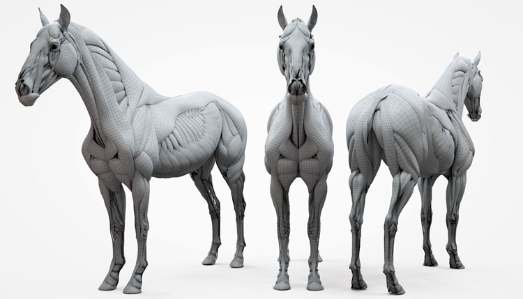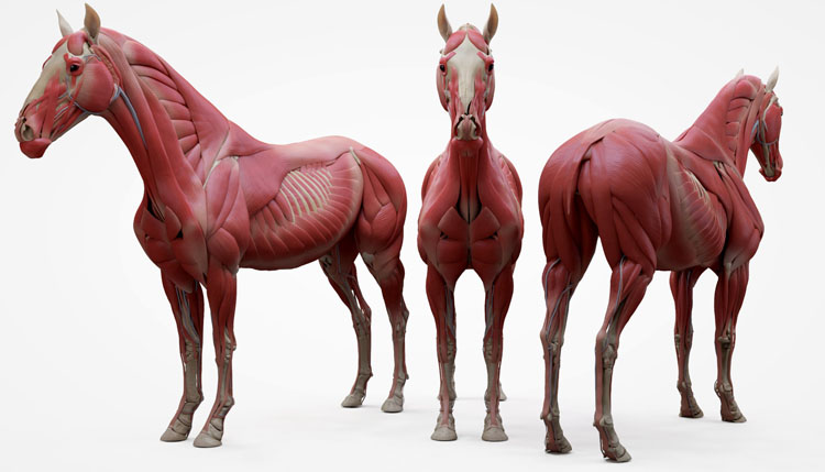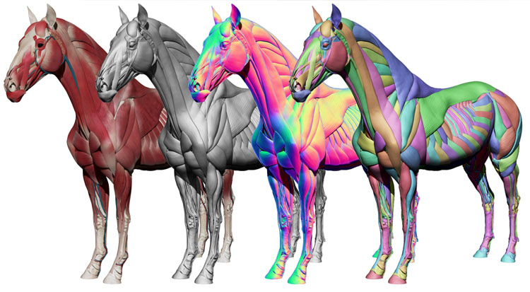 我们的马 Ecorche 模型由动物解剖学专家 Gael Kerchenbaum 精心雕刻而成。该模型具有 3D 扫描头骨和惊人准确的解剖结构和肌肉组织,是真正独一无二的东西。我们已经包含了一个 polypainted Zbrush 文件,其中包含所有肌肉群以及骨架和周围身体网格的单独子工具。还将所有单个模型导出为具有支持颜色和法线贴图的 1 级细分 OBJ 和 FBX。此外,还包含了身体、骨骼和肌肉的抽取 OBJ 文件以及 ZTL 以供快速参考。