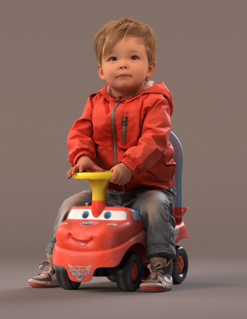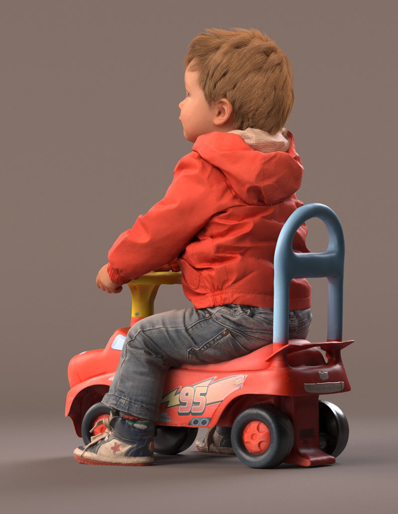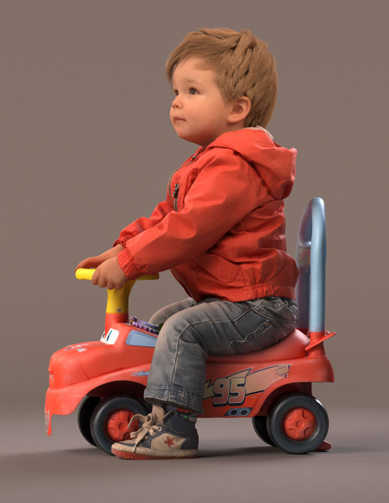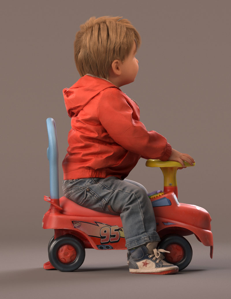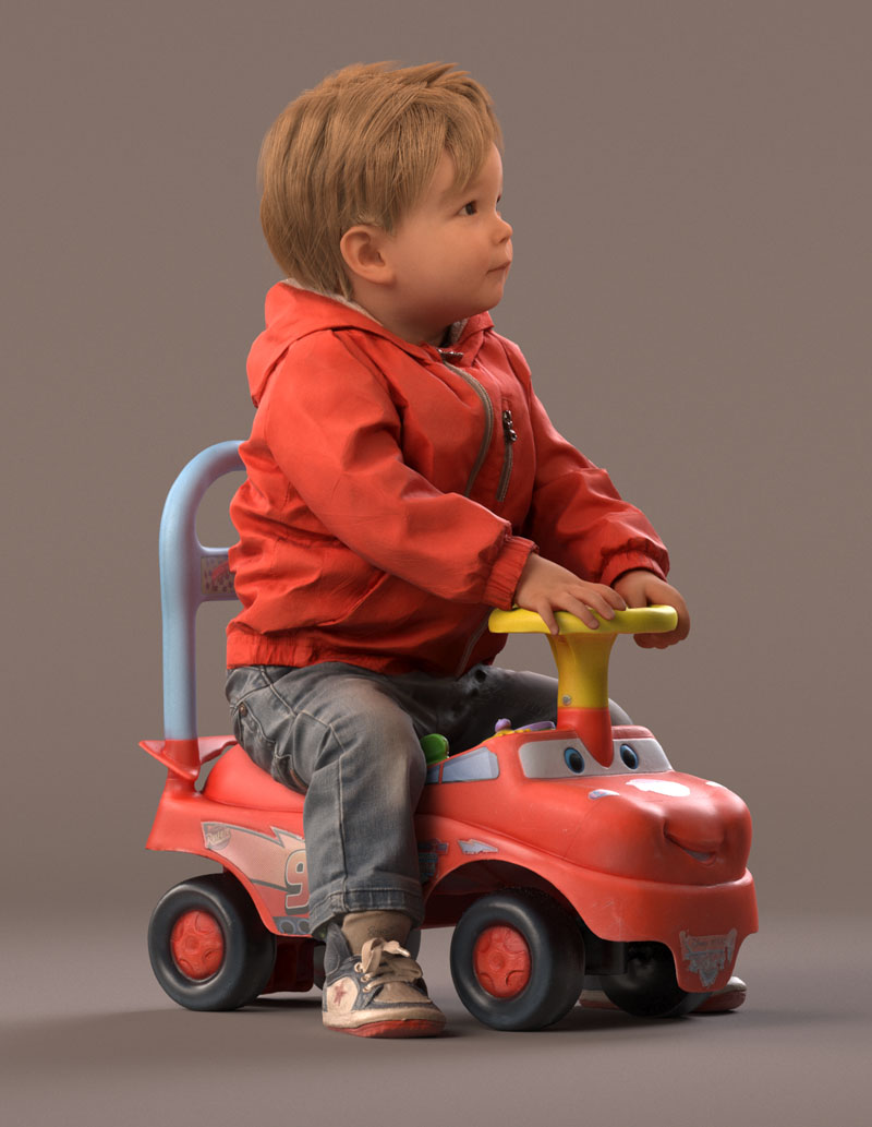 预先设定的儿童 3D 模型穿着休闲外装,穿着牛仔裤、红色夏季夹克、皮鞋。 坐在玩具车上。 玩具车是一个单独的对象(但包括在内)