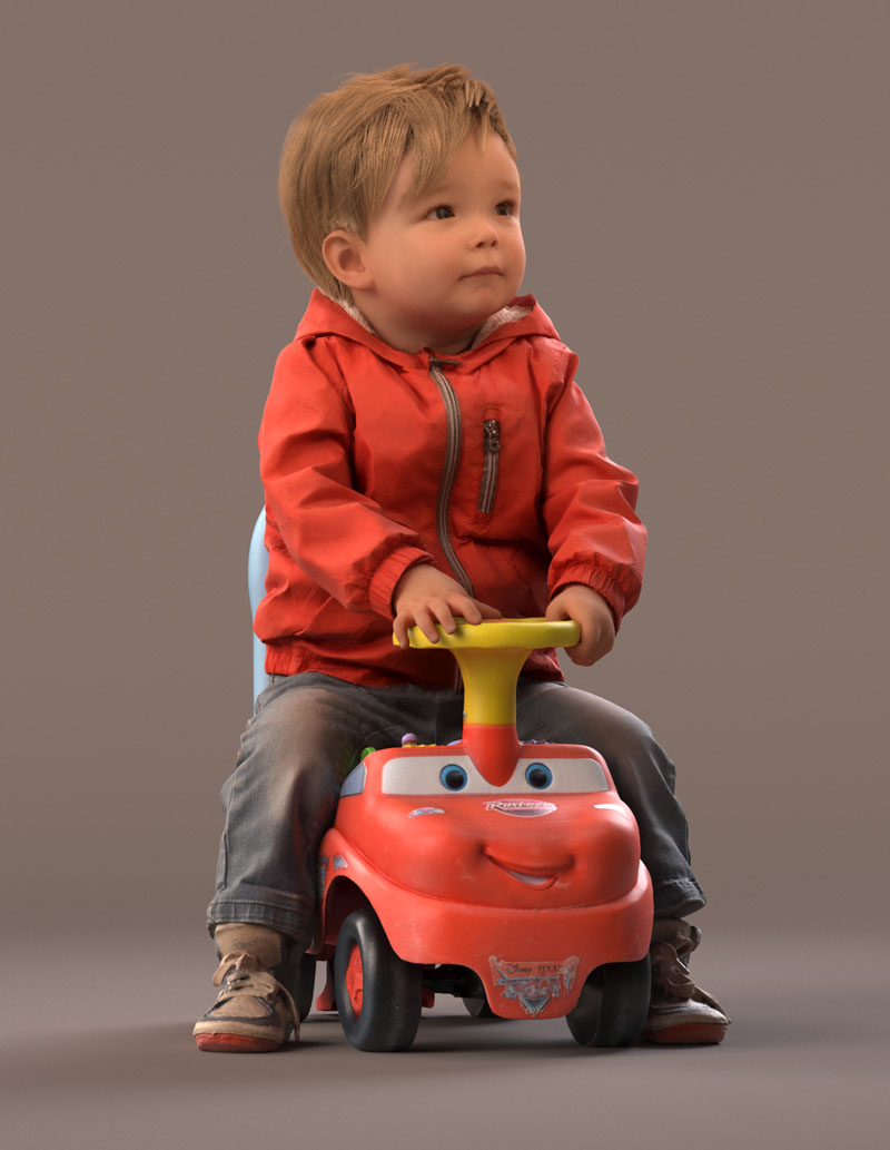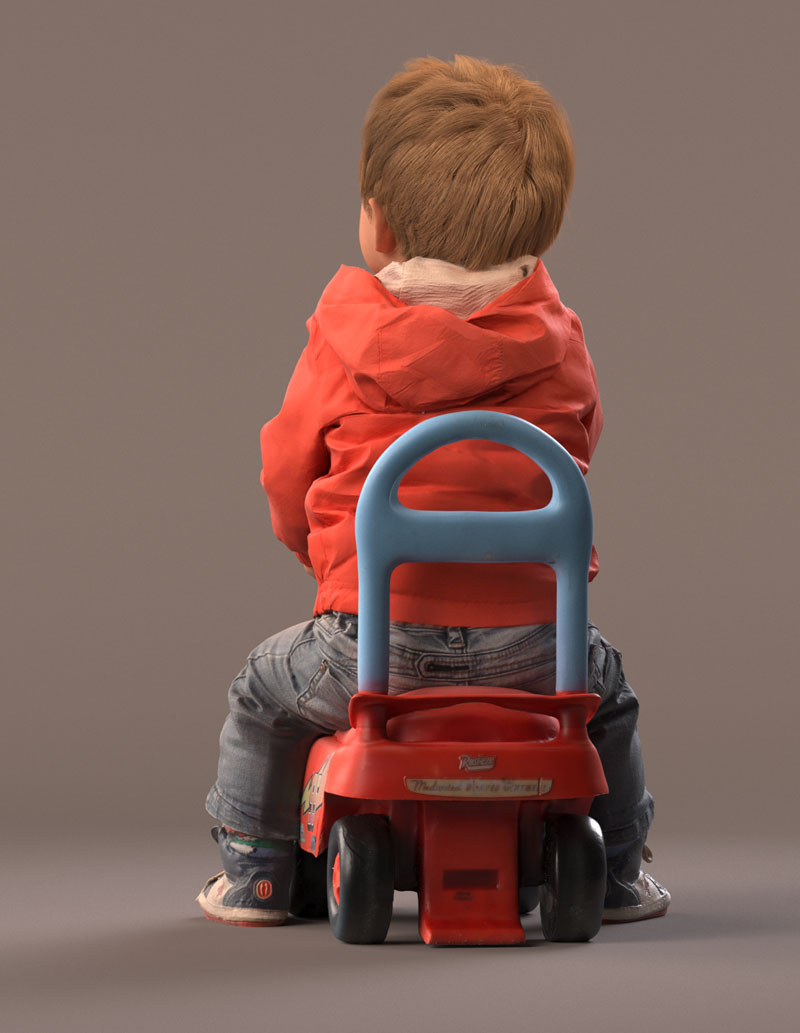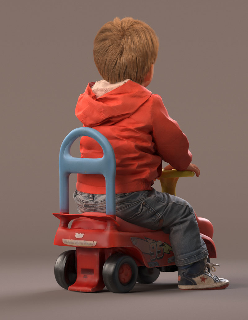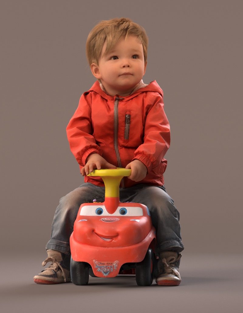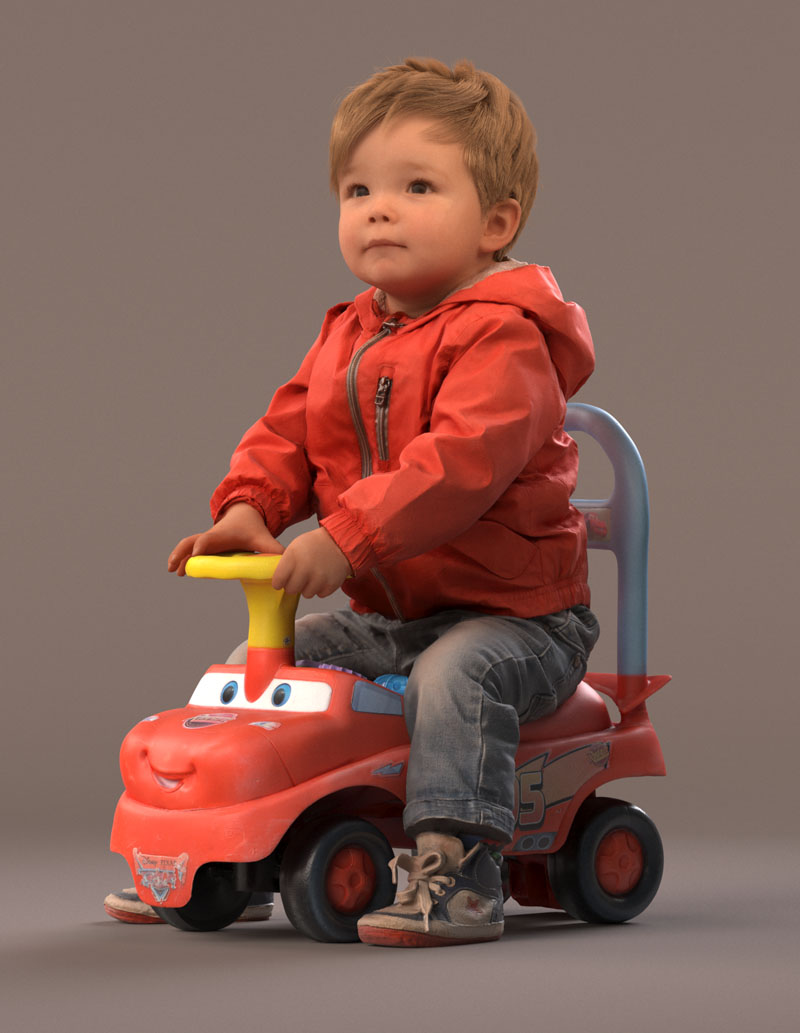 预先设定的儿童 3D 模型穿着休闲外装,穿着牛仔裤、红色夏季夹克、皮鞋。 坐在玩具车上。 玩具车是一个单独的对象(但包括在内)