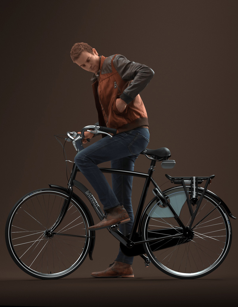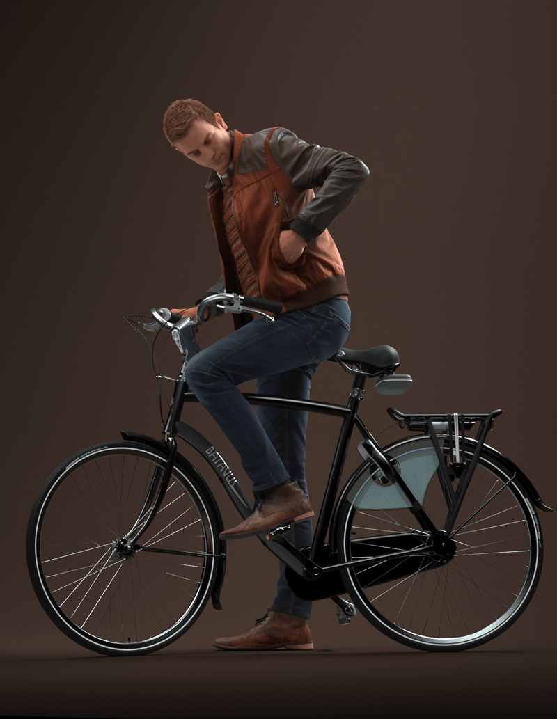 户外休闲装的男性3D模型,穿着一件皮夹克,牛仔裤,毛衣,棕色皮鞋和一件踩在自行车上的衬衫,从口袋里掏出一些东西。