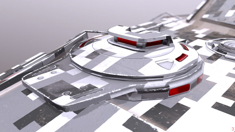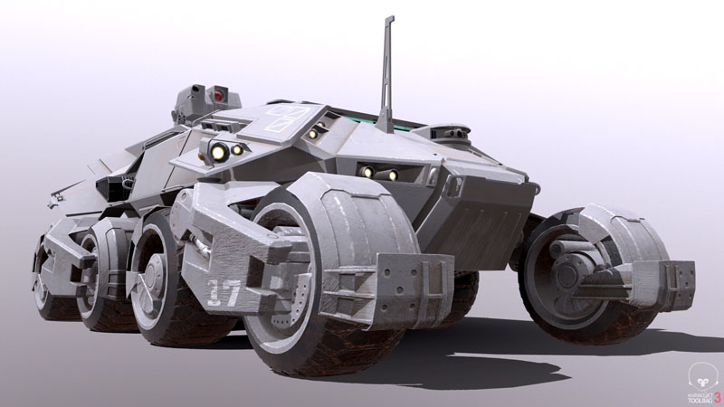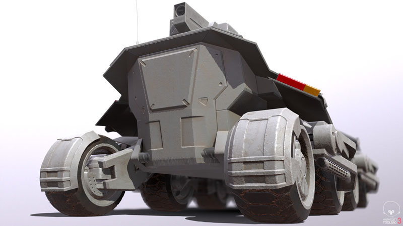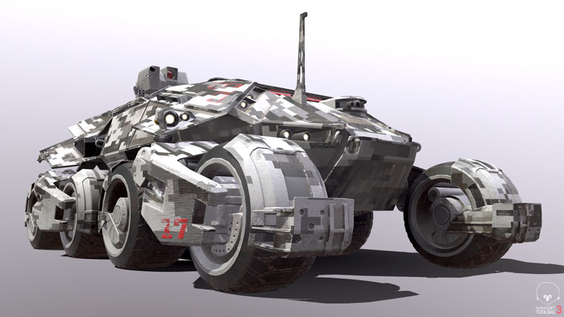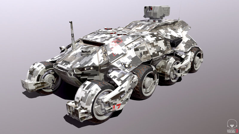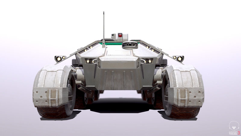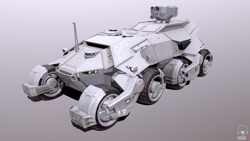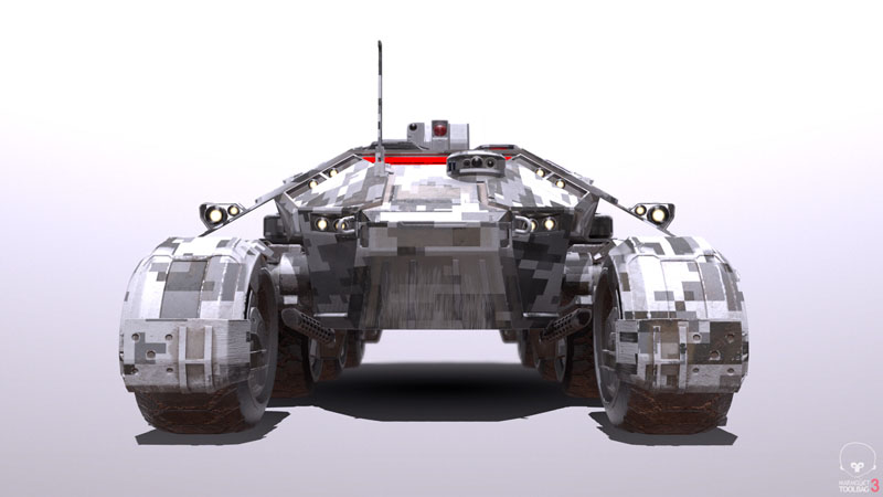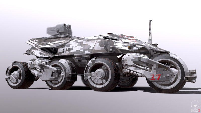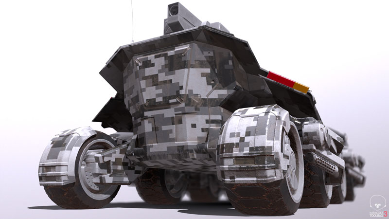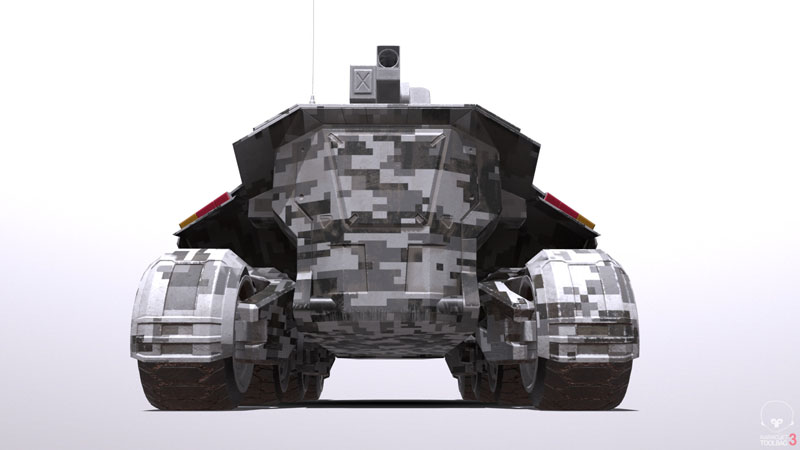 该模型基于 Bandai-Namco / Saver 交互的概念艺术。 有 4 个 UV 集,其中 2 个是用于 bady 和轮子的 8k 纹理,1 个是 4k 纹理,最后一个是 2k 纹理。 低多边形和高多边形模型是在 3Ds Max 中创建的。 低多边形包含约 45k 个多边形。 法线贴图和 AO 贴图是在 Marmoset Toolbag 3 中烘焙的。纹理是在 Substance 画家中创建的。 此外,还有 2 个版本的迷彩:像素迷彩和经典灰色迷彩。