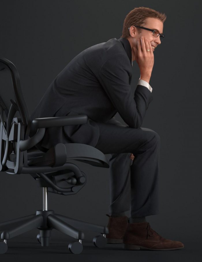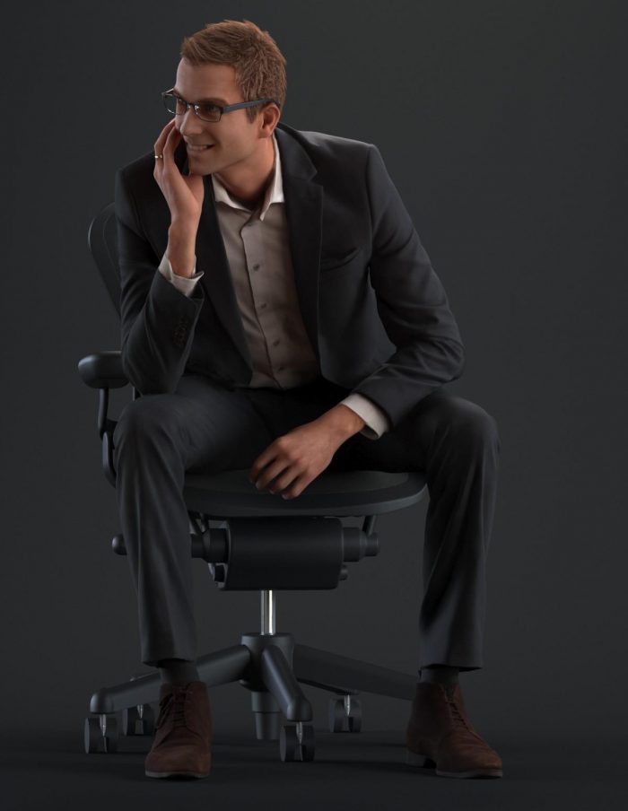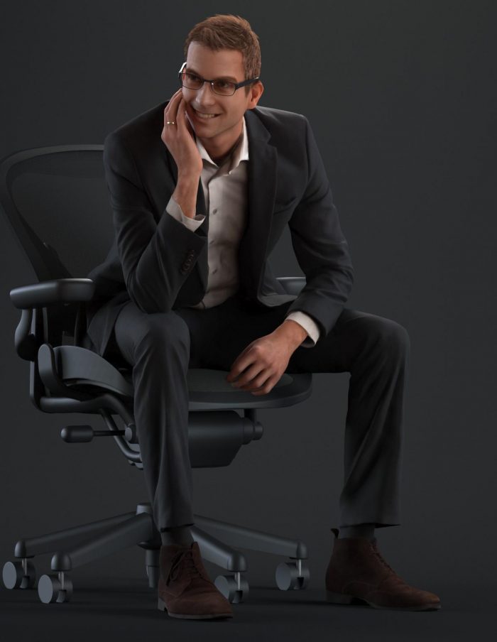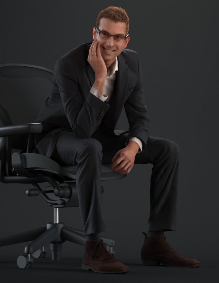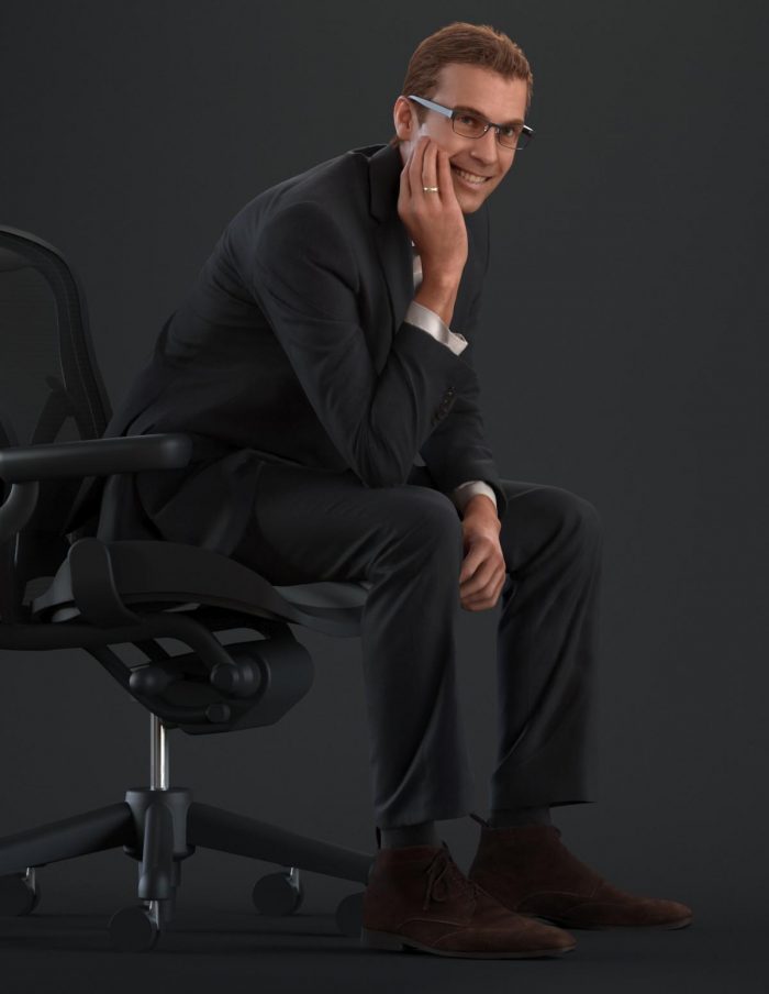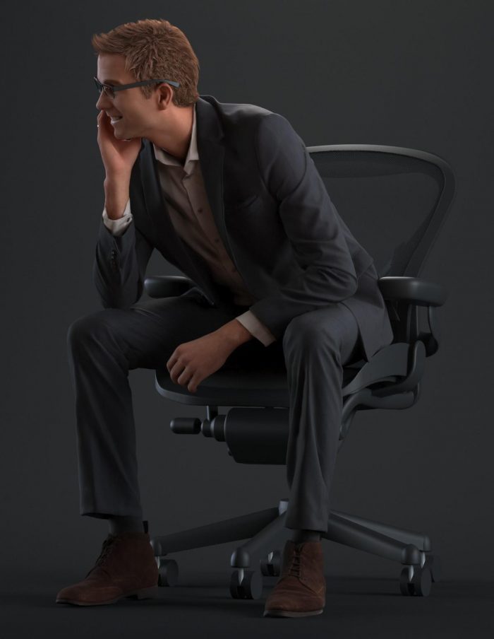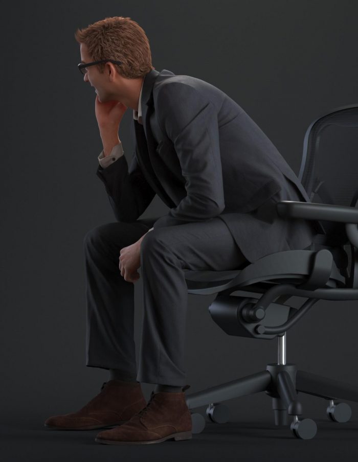 穿着西装,麂皮鞋,白衬衫和眼镜在轻松的坐姿的商务着装男性3D模型。
