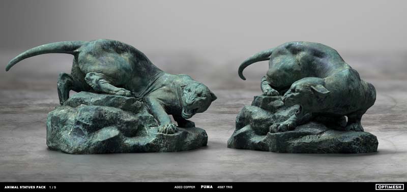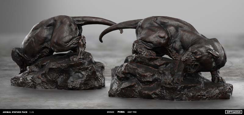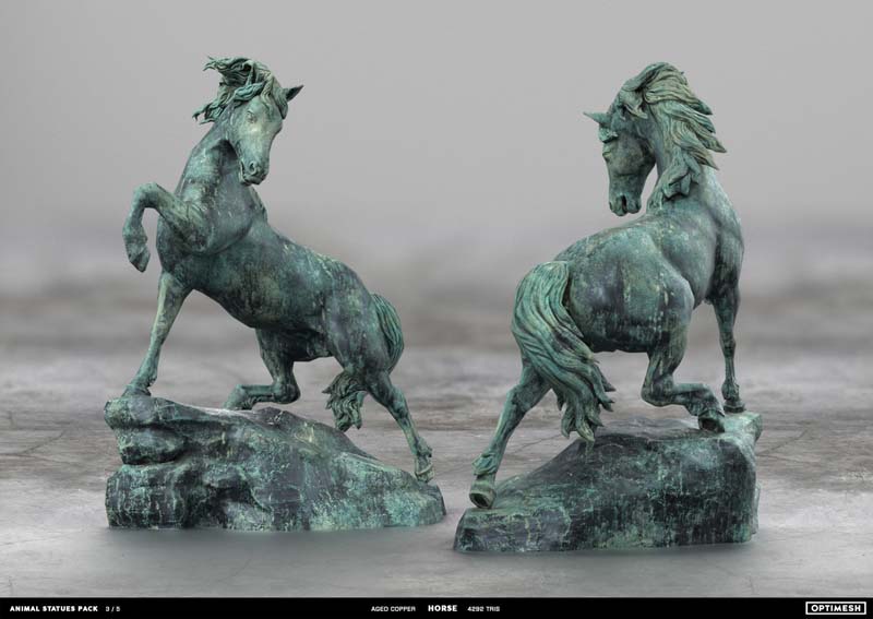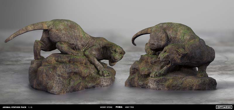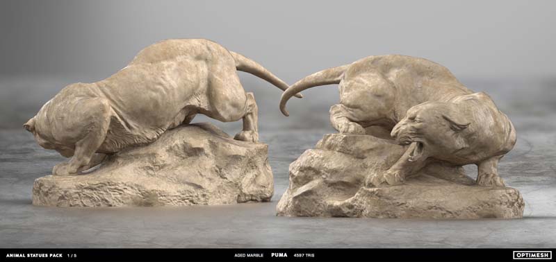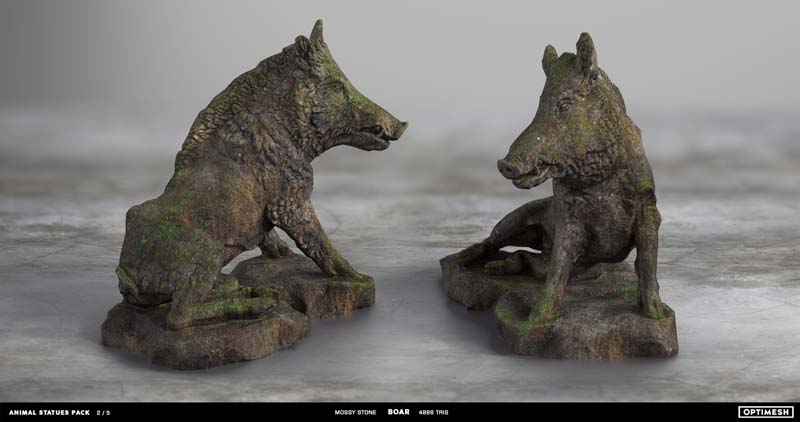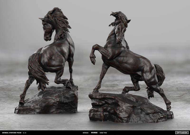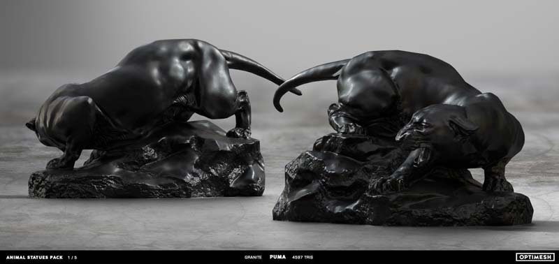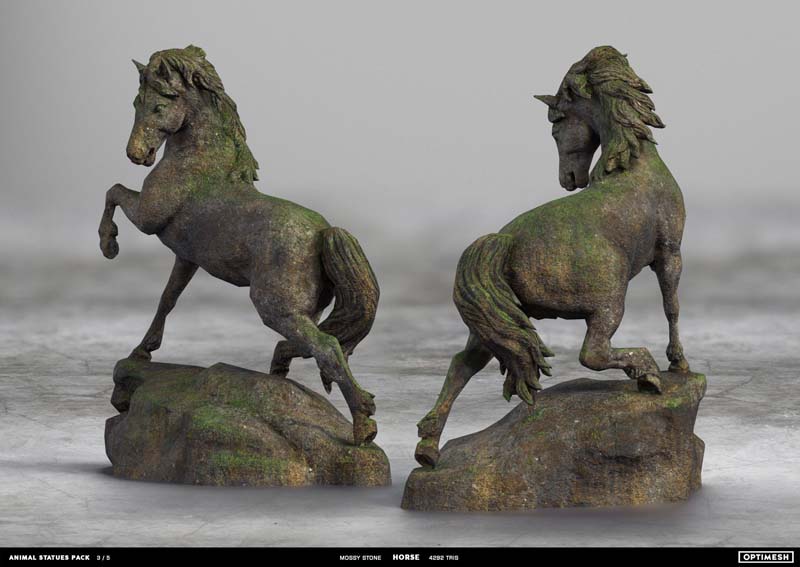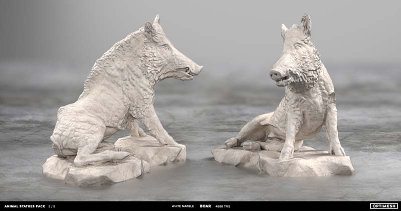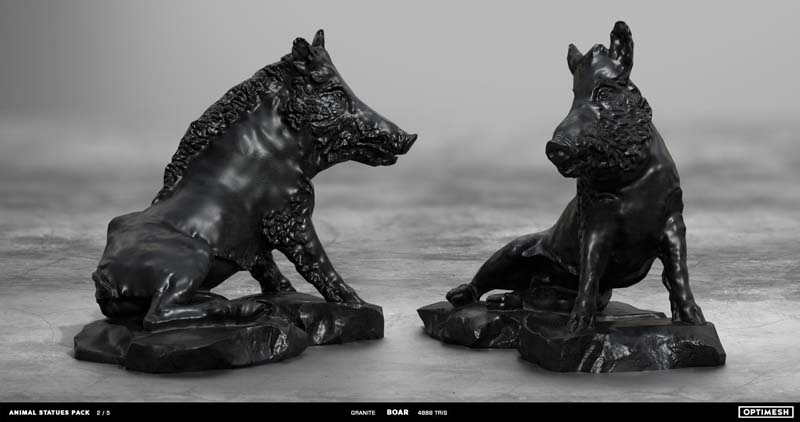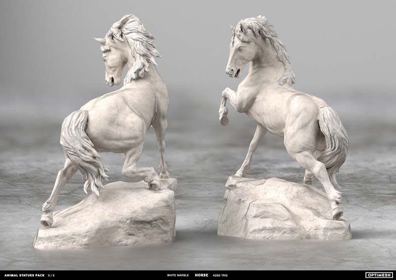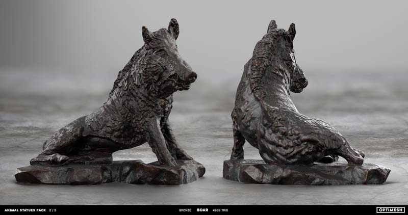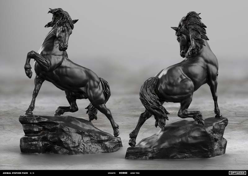 动物状态包中的所有雕像都是使用摄影测量和3D雕刻相结合的方法创建的。详细的手绘4K纹理允许从第一人称角度将其视为游戏对象或环境元素。每种型号有六种材料可供各种场合的室内和室外使用,因此可以放置为桌面小雕像和全尺寸的纪念碑。