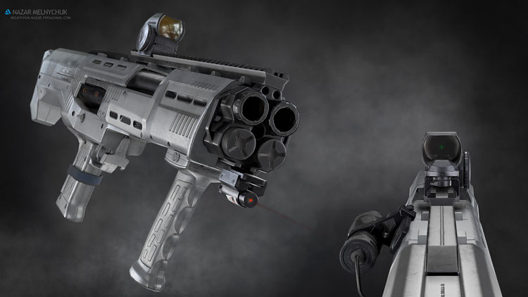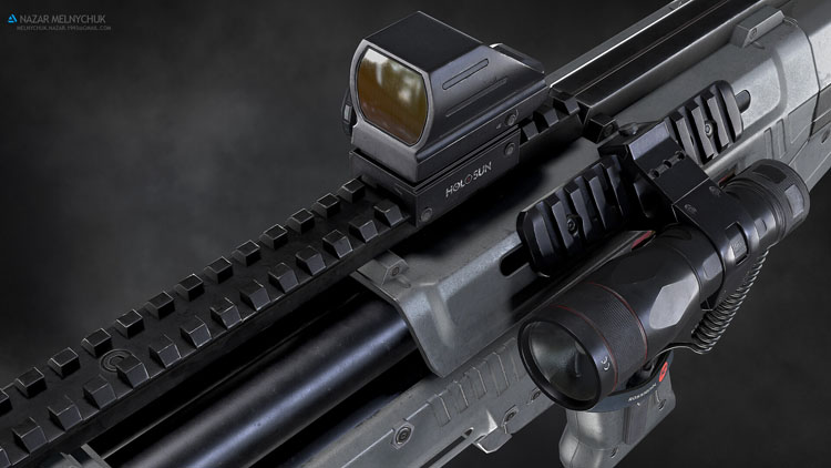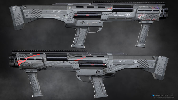 本作品由5个纹理集组成,其中3个是霰弹枪本身,另外2个是霰弹枪的配件。 4K 纹理