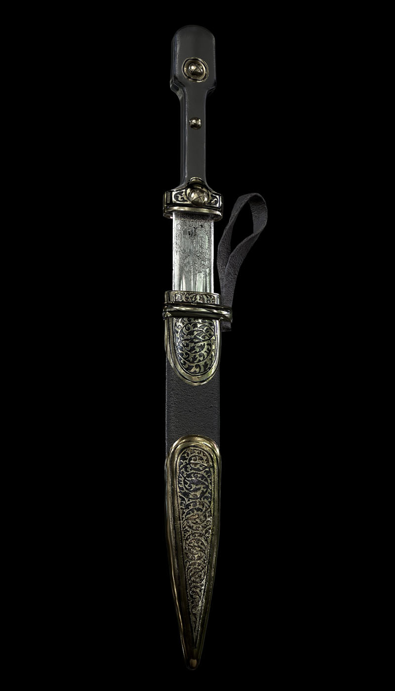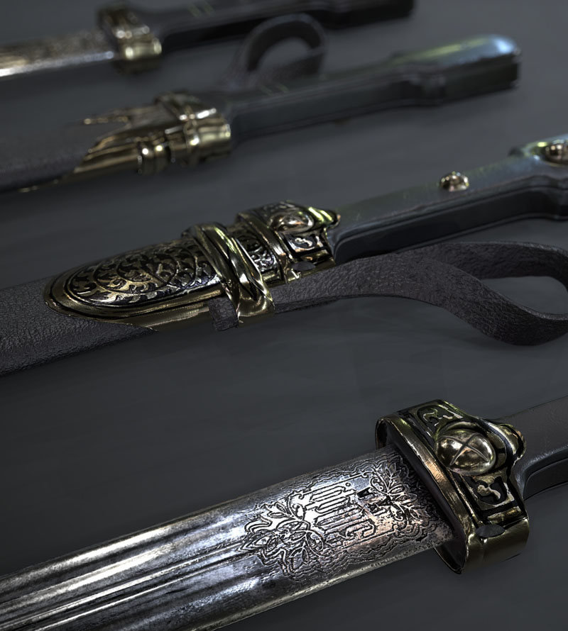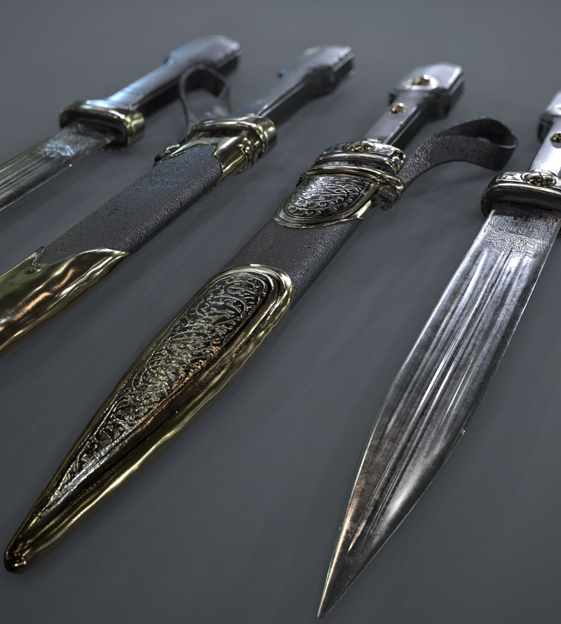 用 Maya 为这把古董匕首建模,用 zbrush 雕刻,用 Substance Paint 制作纹理,用 marmoset 工具包渲染。
