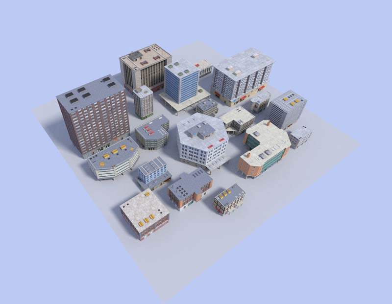 每个建筑都是完全纹理和uv映射,高品质的纹理。低多边形为游戏或渲染,装饰场景的理想选择。
