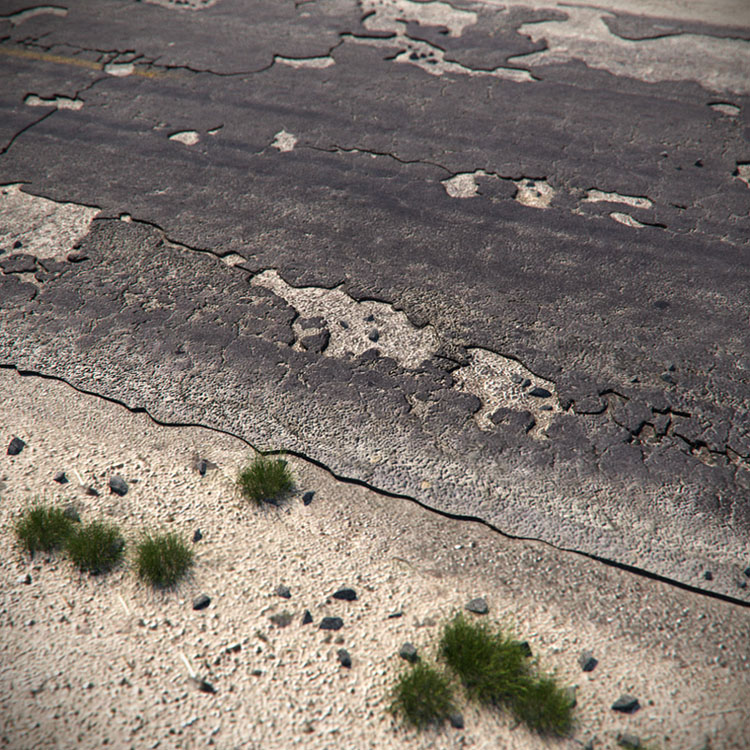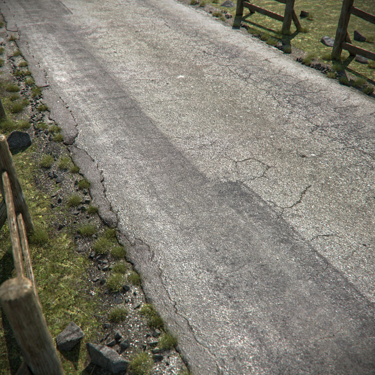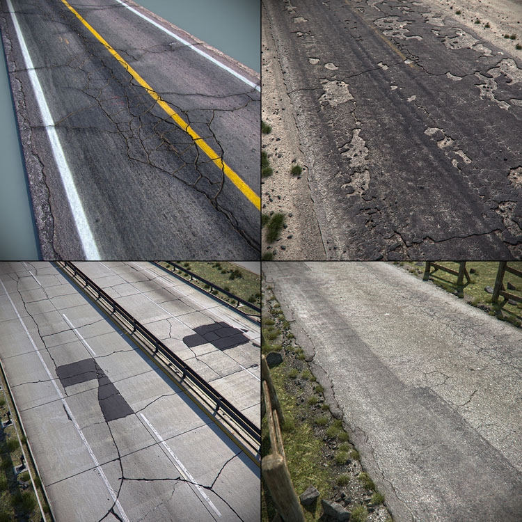 收集包括 4 条非常详细的裂缝沥青瓷砖道路,有许多细节,如护栏、木栅栏、石头。